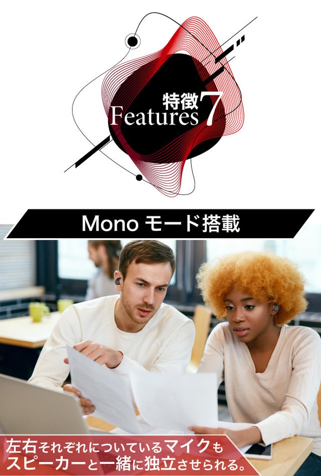 Monoモードは、左右のイヤホンを独立させることが出来る機能。左右独立させて別々の端末に繋ぐことも可能です。左右それぞれの本体についているマイクも独立して働くので、リモート会議中に2人でイヤホンをシェアできます。 ハンズフリーイヤホンとしてや、インカムとしての使用も可能です。