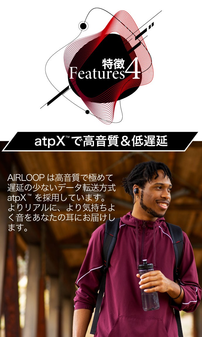 アメリカの移動体通信技術および、半導体の設計開発を行う企業Qualcomm社製のスマートオーディオチップを搭載したAIRLOOPは、超低遅延の信号で非常に安定した接続性を提供。地下鉄で通勤をしているときも、ランニング中にストリーミングをしているときも、タイムラグのないクリアで流動的なオーディオを体験できます。