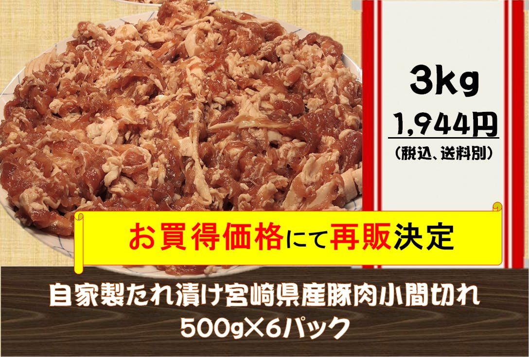 クラウドファンディング挑戦時、完売しました「自家製たれ漬け宮崎県産豚肉小間切れ」をこの度、破格の金額で2種類再販することになりました。