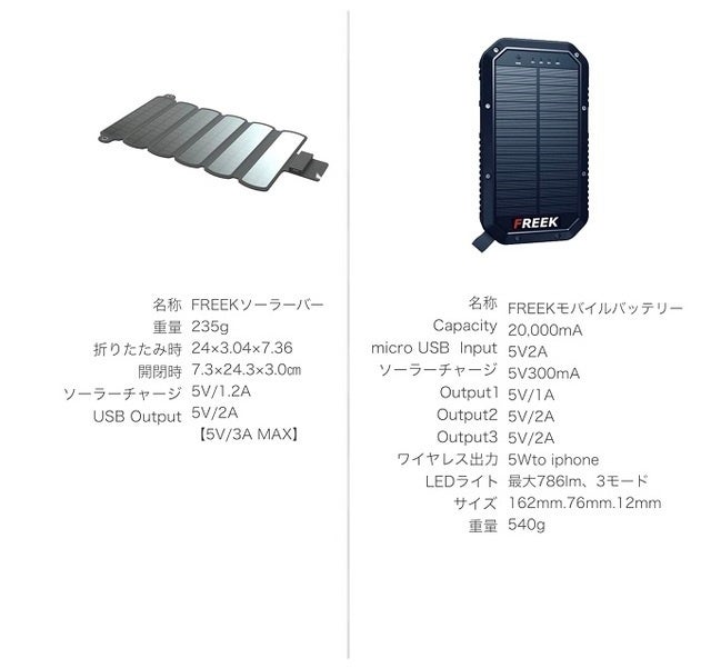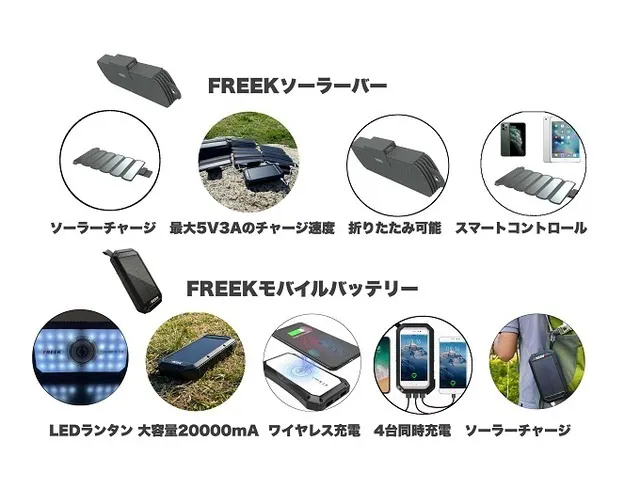 日本のクラウドファンディングサイトで登場し、半年もしないうちにシリーズ累計2000個を記録したソーラー機能を搭載したモバイルバッテリーです。今回開発したのがFREEKモバイルバッテリーに蓄電できる、折りたためるソーラーパネルFREEKソーラーバー です。