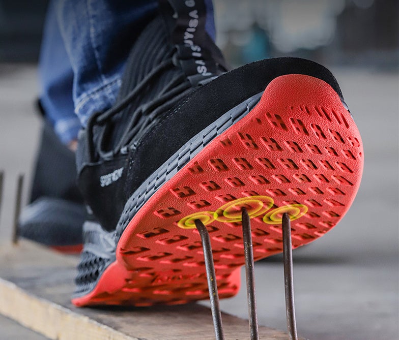 足裏には、防弾チョッキにも使われている、ミリタリーグレードのケブラー繊維を使用。釘を踏んでも、もちろん、金属片の山を踏んでもビクともしません。