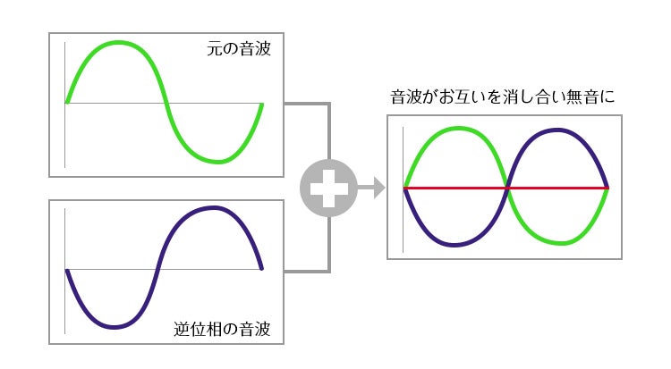 簡単に言えば、周囲の雑音と逆位相の音波をマイクから発生させることで、その雑音を打ち消す仕組みです。