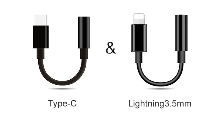 『ヘッドフォンジャックアダプタ』を使用すれば当商品の利用が可能ということで、今回は、Android用のType-CとiPhone用のLightning(ライトニング)変換アダプタの2本を同梱しています!