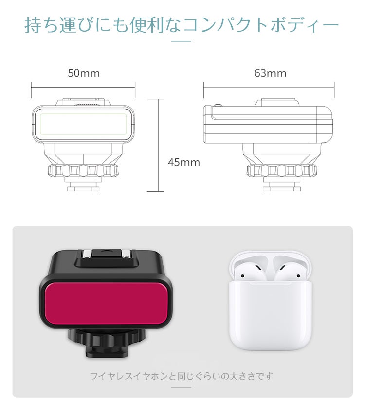 ライト自体の大きさは63×50×45mm。これはワイヤレスイヤホンとほぼ同じ大きさになります。