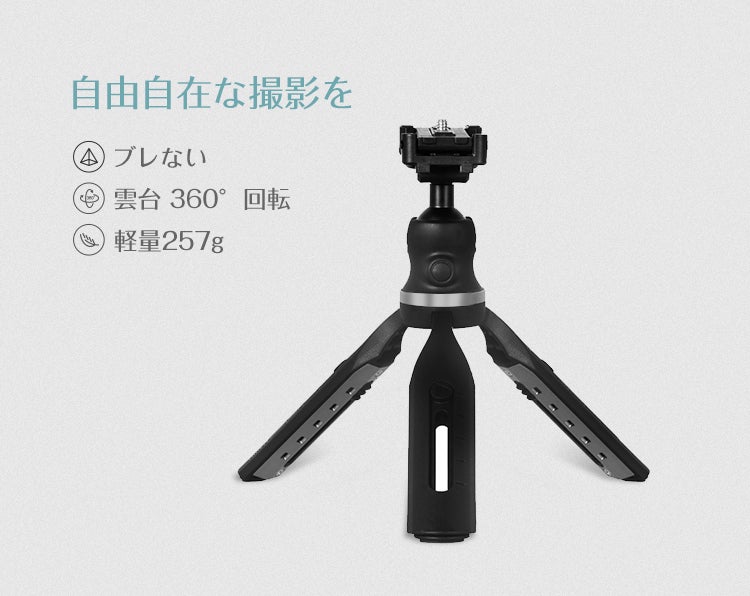 好みのアングルで動画を撮影でき、手振れも防ぐことができる便利な三脚。付け根部分にボール雲台が付いているため、角度の調整も自由です。