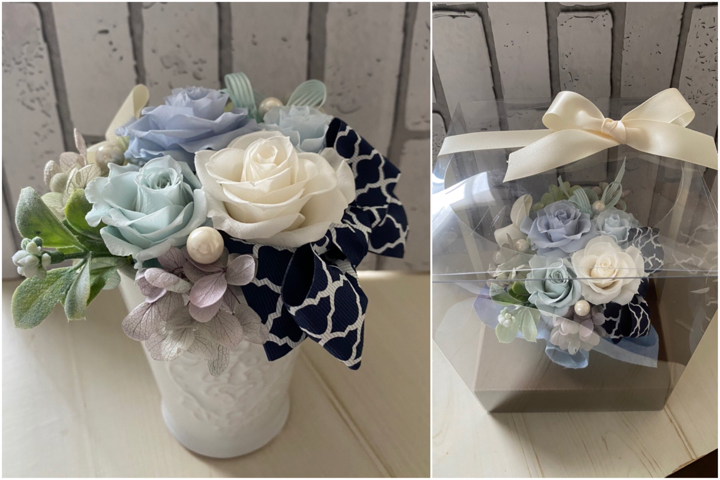 内容:プリザーブドフラワーのアレンジです。お申し込み時は、花器またはボックスの記入をお願いします。お届け時にはケース&リボンがつきます。