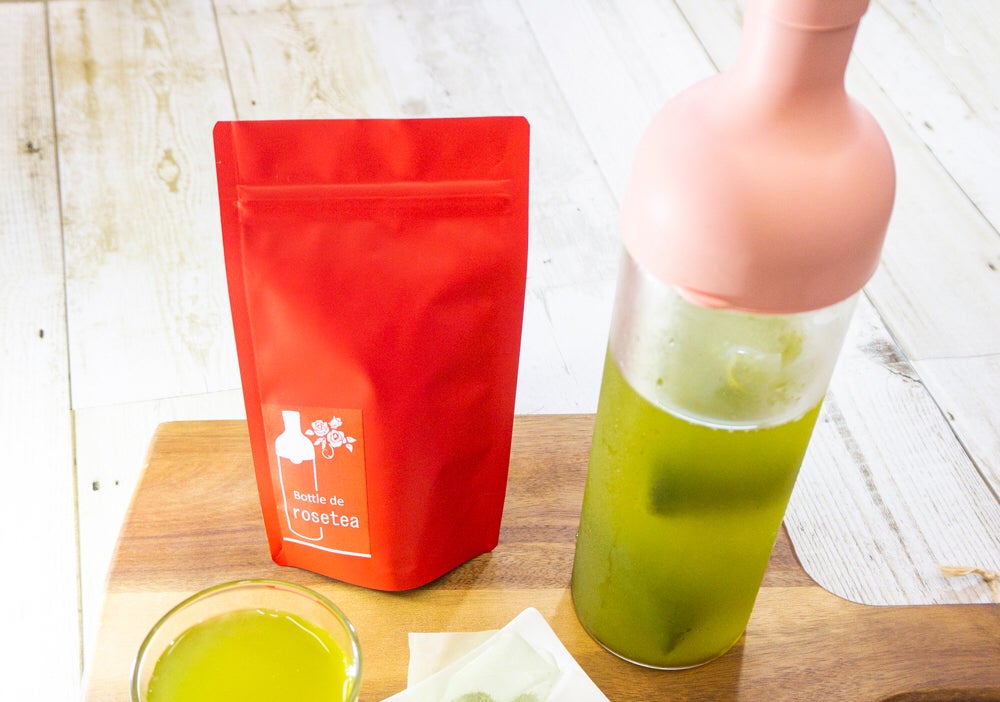 内容:ほんのりバラ香る「ばらの緑茶」とおしゃれなフィルタインボトルのセットです。