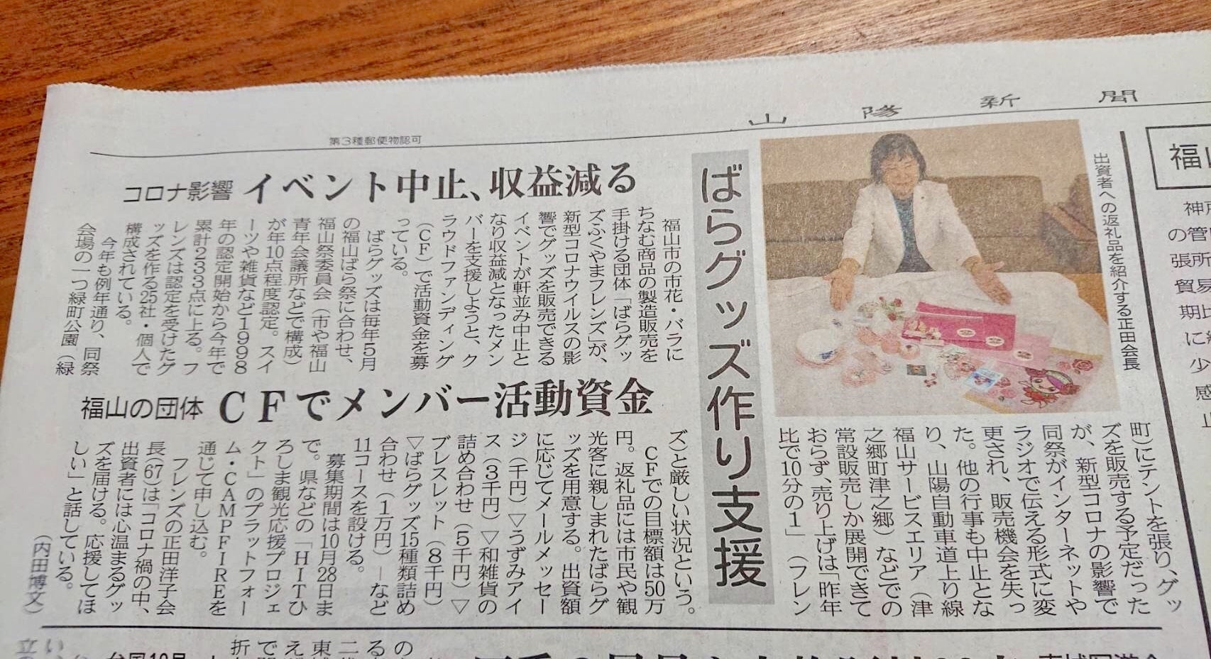 2020春からのコロナの影響を受け、メイン活動のばら祭販売、県内外へ出向く観光PRでの販売がゼロ、ばらグッズ講座などがストップして秋以降も活動の見込みがありません。