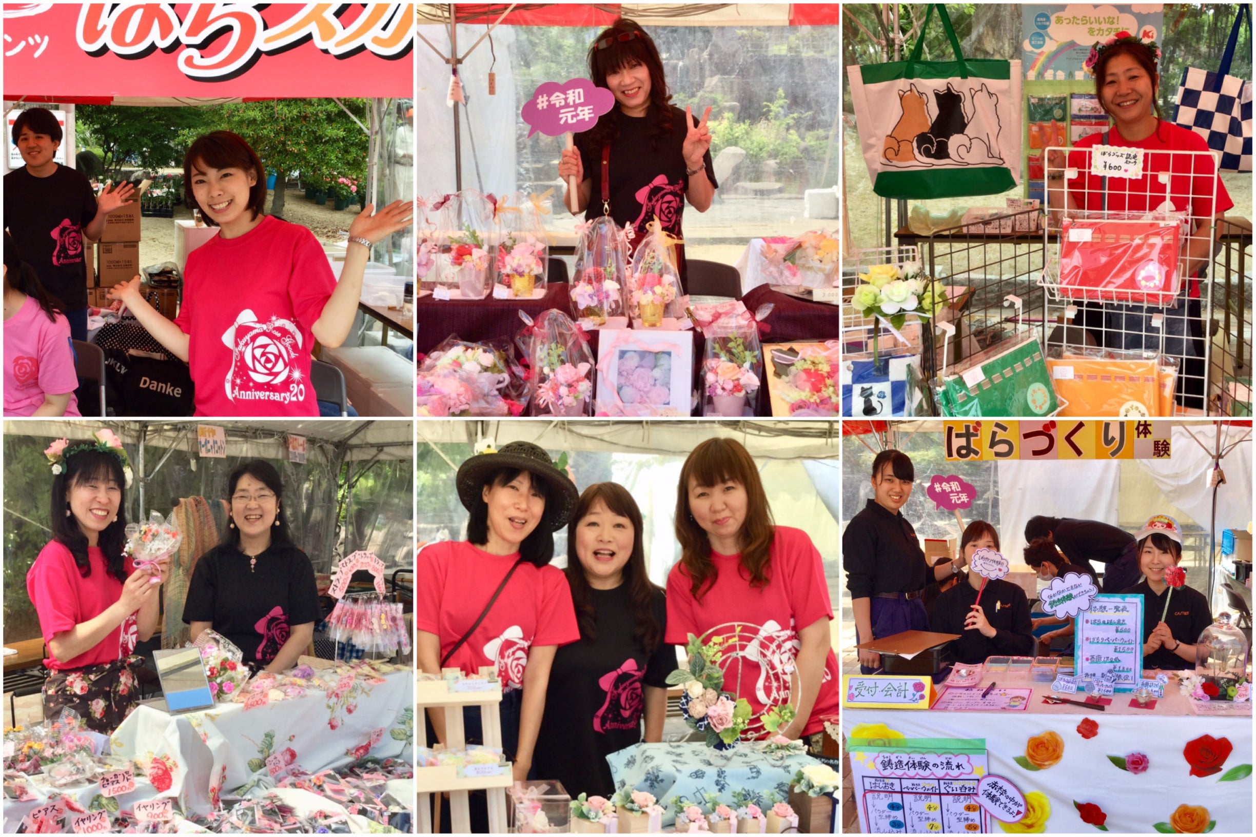 私達の活動のメインは、福山ばら祭での販売です。福山市緑町公園にテント11張のスペースを頂き、《ばらグッズミュージアム》と題して、それぞれのメンバーが 持ち味を活かした商品構成、笑顔、笑声の対面販売を行なってきました。