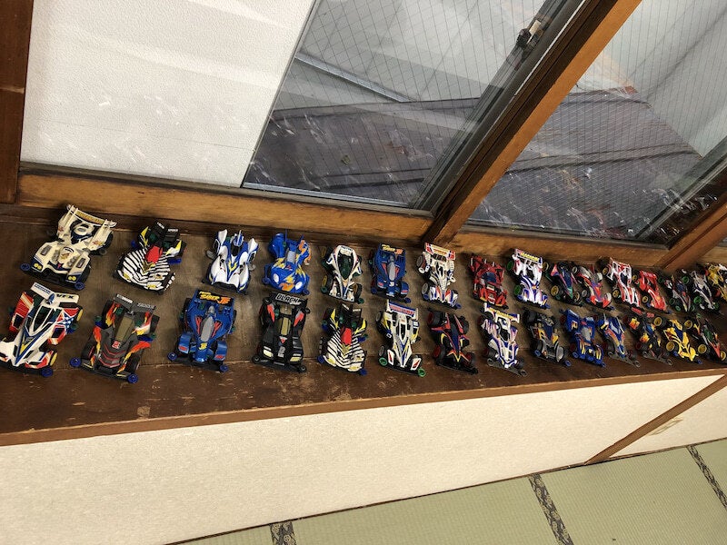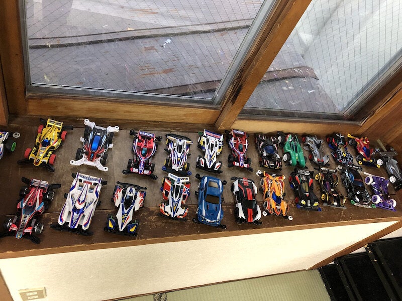 コースの横に並ぶマシンのコレクション。舘田さんが幼いころから少しずつ集めてきたものだそうです。