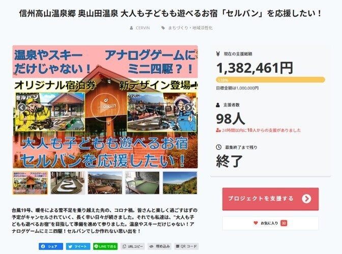 2020/11/24 12:14【11月27日まで残り3日間!ラストスパートの応援をお願いします】セルバンさんとのクラウドファンディングも残すところあと3日間となりました。11月27日が最終日となります。本当に多くの方に支えられここまで来れたこと、改めて感謝しております。「オリジナル宿泊券」では、高坂様、三毛様、ハラダ様と、セルバンさんを応援する三名の方々にご協力頂き、他にはない、素敵なリターンが完成しました。「チェックイン時に作品が完成する仕掛け」も用意され、いつかセルバンさんへ行く日が楽しみになる、遊び心に溢れた宿泊券です。紹介ページには、セルバンさんの歴史やこれまでの苦労と共に、長大温泉同好会や川口プロヂュースの方々による紹介動画も追加され、これまでセルバンさんを応援してきてくれたファンの方々だけでなく、これから行ってみたいという人にも、沢山の魅力が伝わる内容になったと思います。どうか、少しでも多くの方に、この挑戦を知って頂き、支援を集められればと思います。ゴールまでどうか、情報のシェア・拡散を宜しくお願い致します。 もっと見る