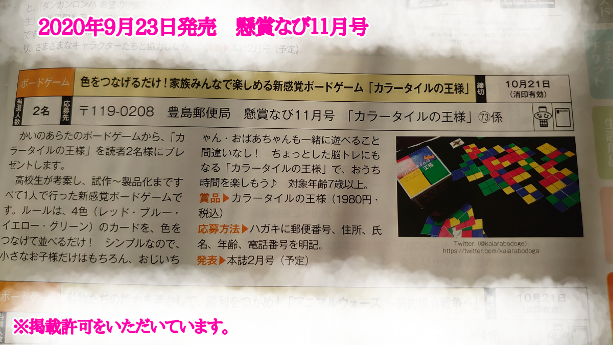 前作『カラータイルの王様』が2020年9月23日発売の日本で唯一の懸賞雑誌「懸賞なび(11月号)」にて掲載されました!