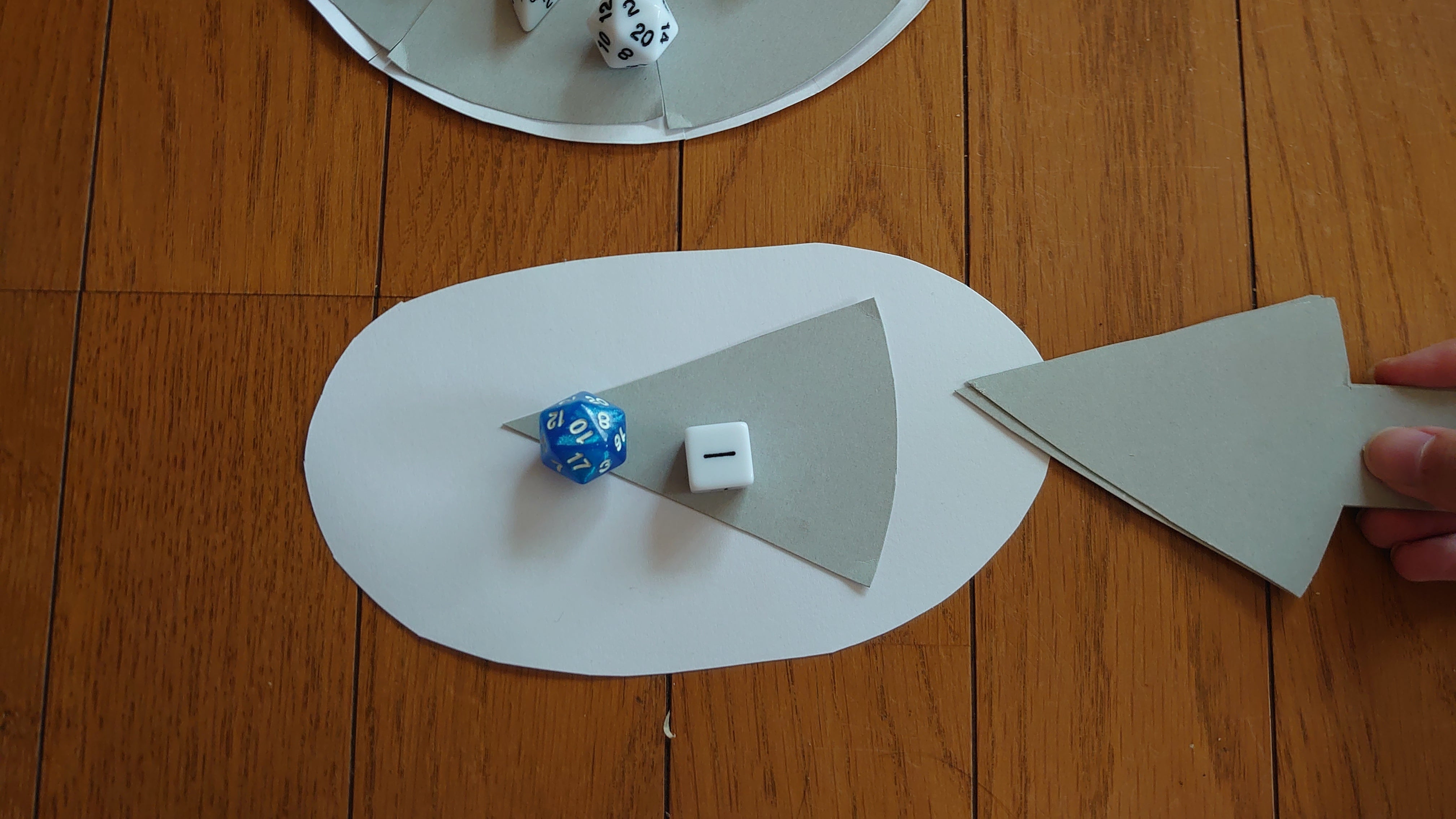 ⬆⬇試作品のようす (実際はピザ生地部分やお皿部分にイラストがつきます。サイコロにも絵柄が載る(シール)予定です。)