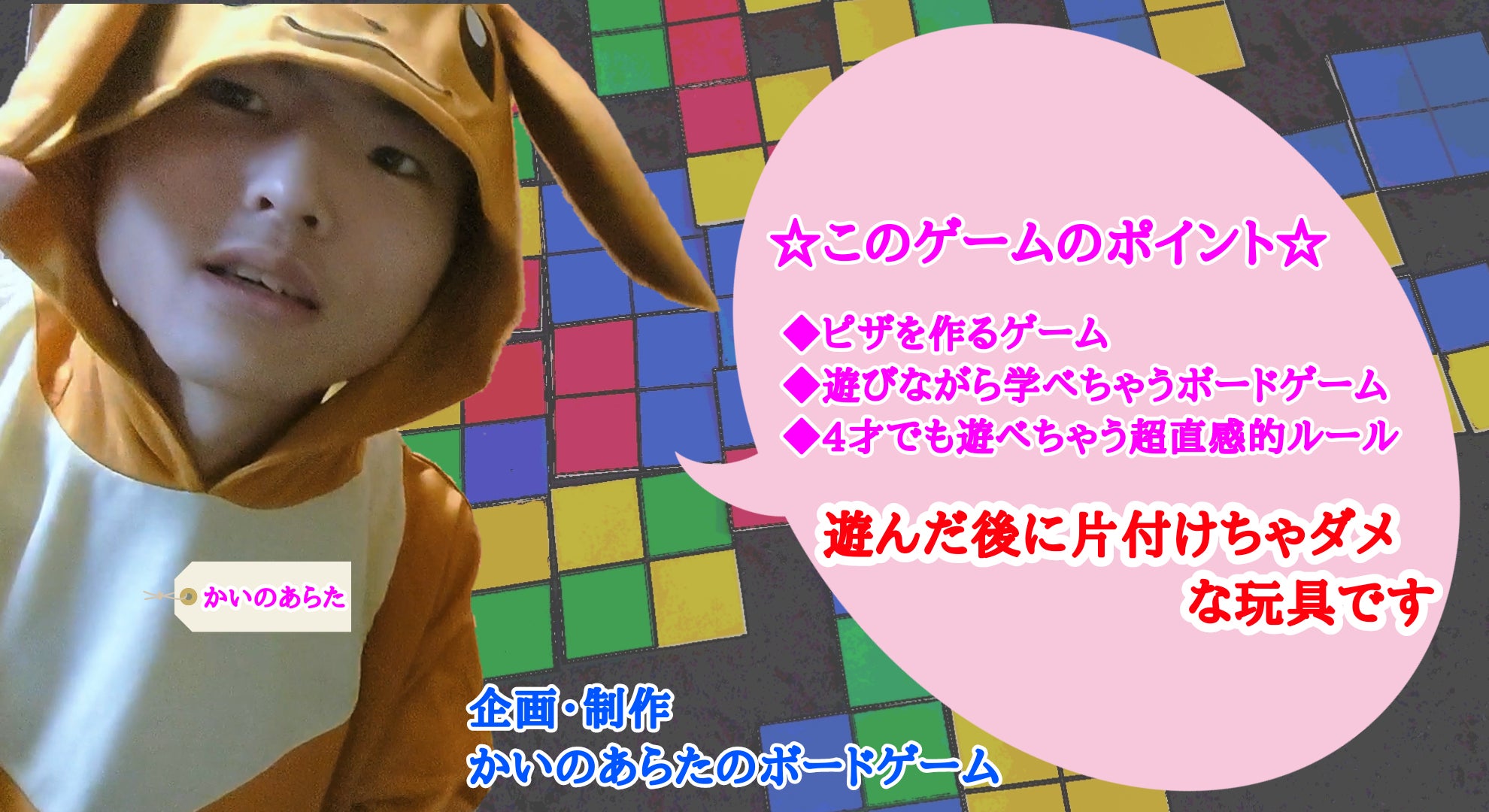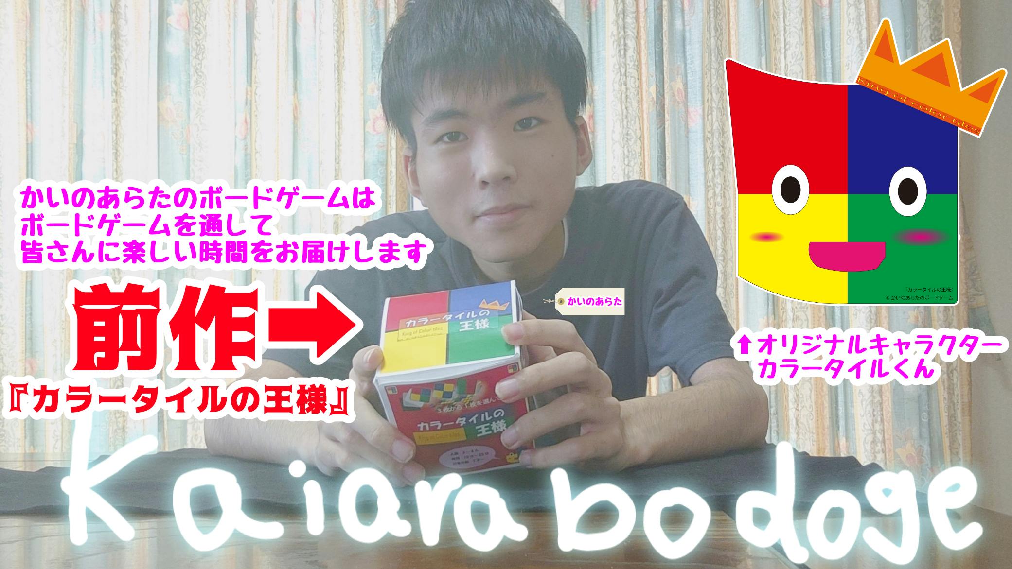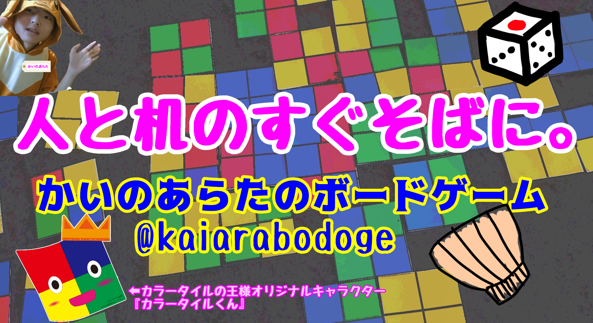はじめまして!ボードゲーム博士の かいのあらた といいます。(ボードゲーム博士というのはボードゲームが好きすぎて自分で付けました)僕は100個以上はボードゲームを暗記しています!!また、前作『 カラータイルの王様 』は現在販売中です!^_^