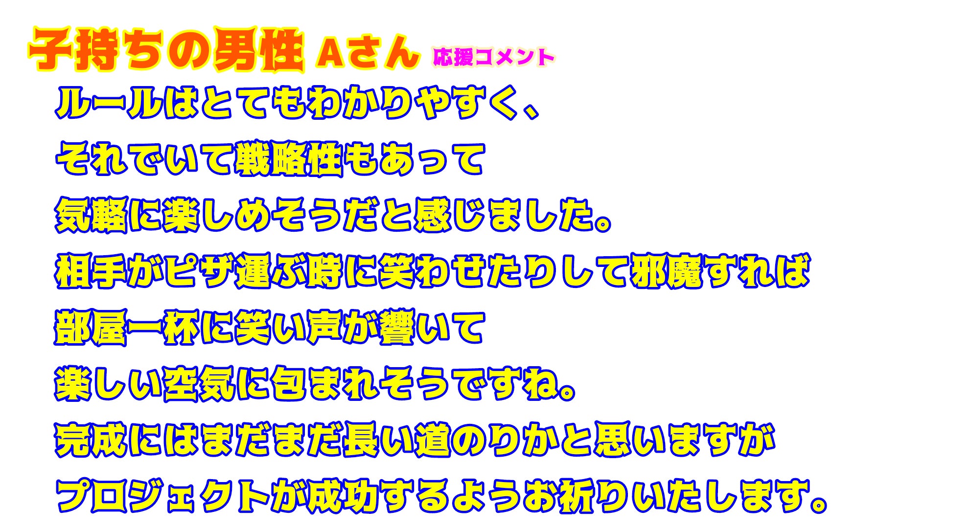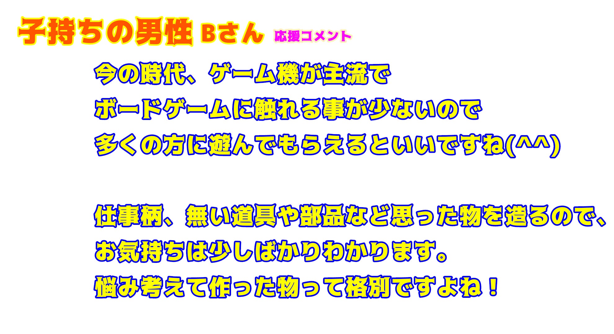 中学生の頃にはまだクラウドファンディングという存在を知りませんでした。だから、ただボードゲームが好きというだけで経済力が無い自分にはゲーム制作はできないの(もしくは大人になった数十年後)だと思いこんでいました。今この場を借りてクラウドファンディング運営のCAMPFIRE様にはお礼を申し上げます。