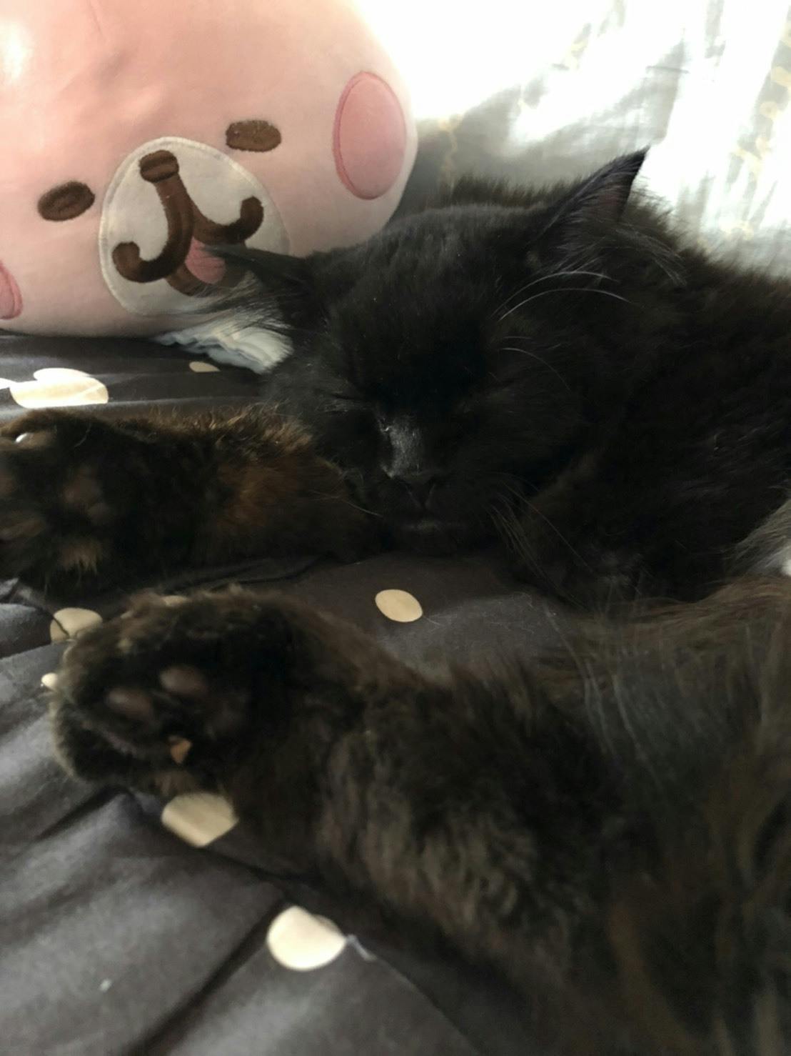 私のお気に入り、カナヘイクッションの隣で爆睡中のちびさんです。