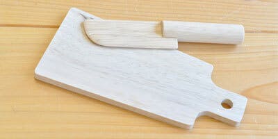 包丁とヒノキで作ったオリジナルままごと用まな板に、お礼のメッセージを添えてお届けします。