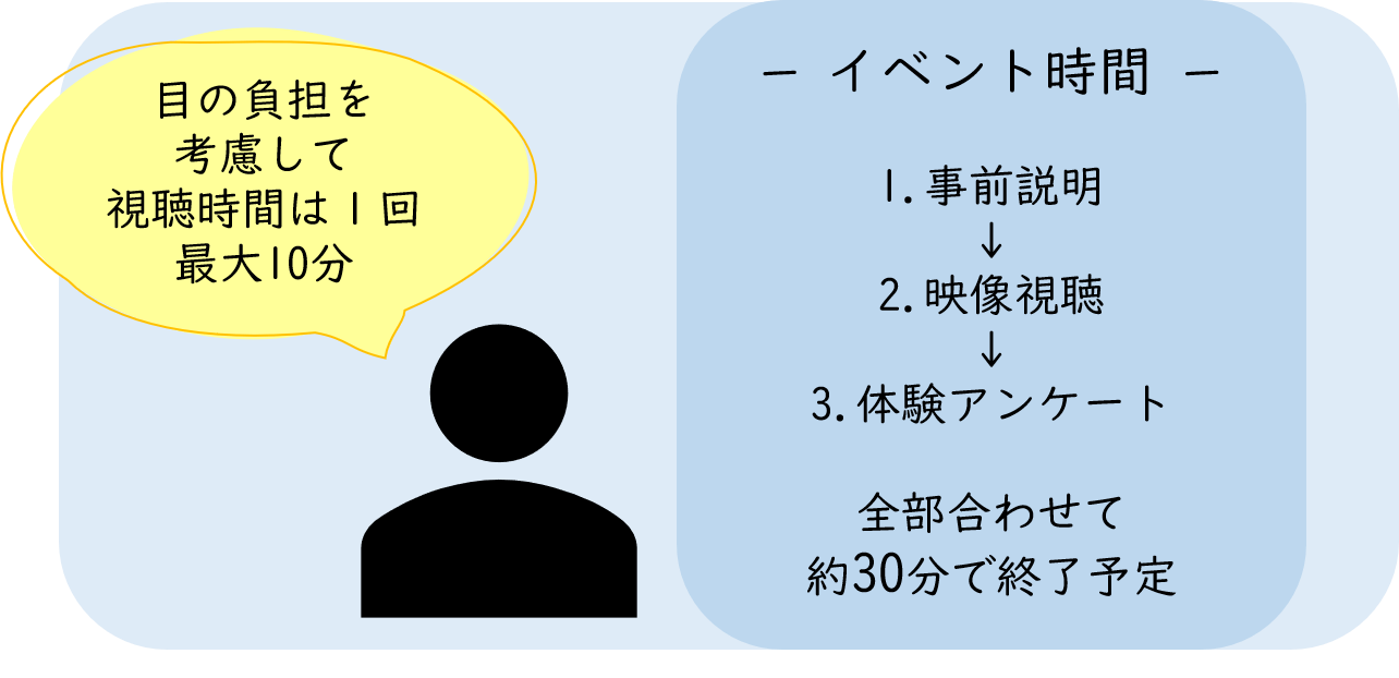 配布する段ボール製のVRゴーグルを着用していただくだけで準備完了です。あとは視聴していただくだけです!(視聴中に気分が悪くなられた場合は、すぐにVRゴーグルを外していただくことを推奨します)