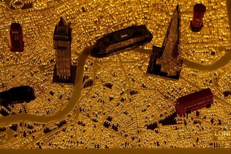 ② 微細なディテールにより街並みを表現。オープンストリートマップをベースとした精巧な3Dアート。