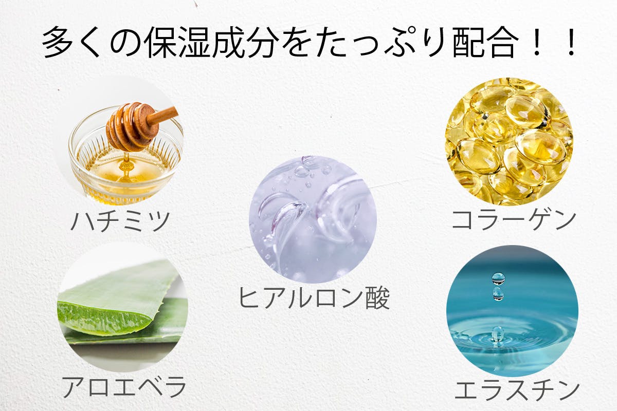 ハチミツ、ヒアルロン酸、コラーゲン、アロエベラ、エラスチンを高配合し多くの保湿成分を配合しています。1枚につきたっぷり美容液1本分(25ml)が含まれているため贅沢な保湿感が味わえます。