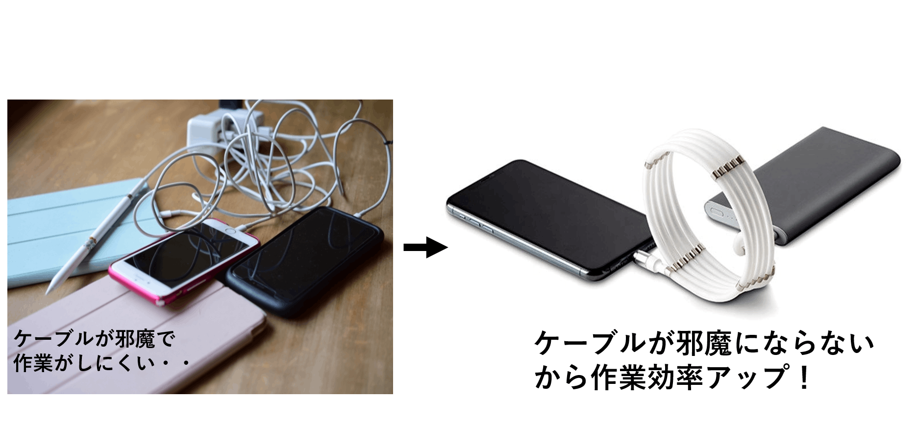 充電ケーブルのデメリットであったごちゃごちゃして絡まるという課題をスッキリ解決し、