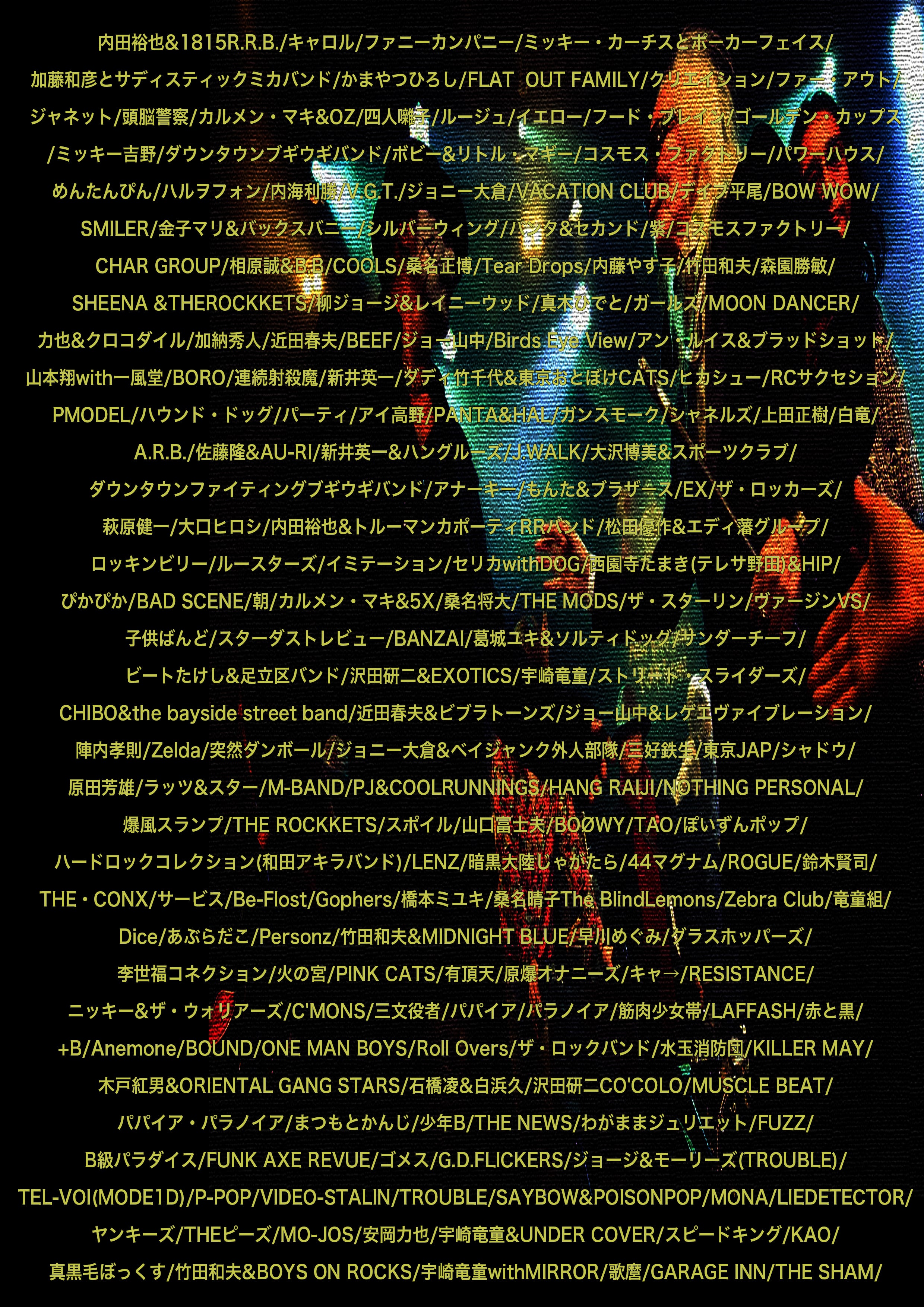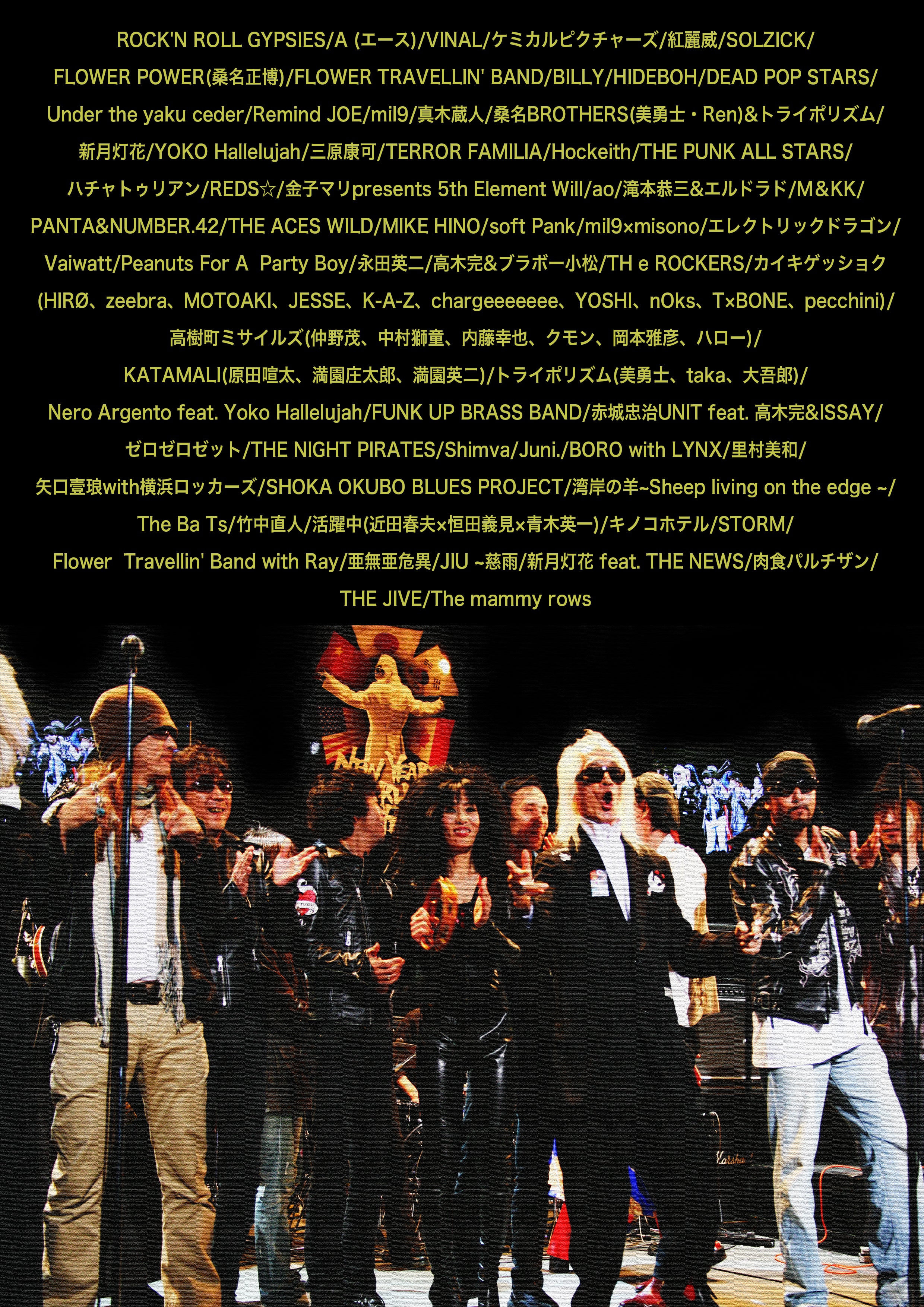 ミスターロックンロール内田裕也が『紅白だけが祭じゃないぜ』をスローガンに開催。スーパースターからアンダーグラウンドまで反骨精神旺盛なロックアーティスト達が毎年出演し、日本のROCKの登竜門的なイベントとして大晦日を賑わして来ました。
