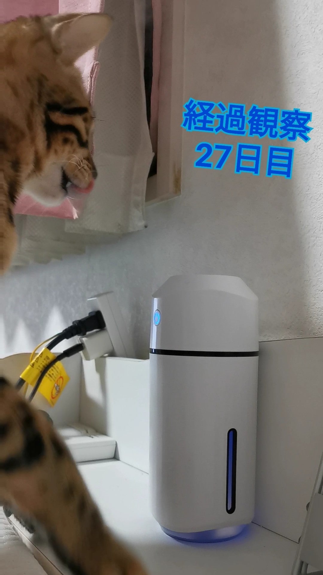 簡易加湿器を付けたら、出てくる蒸気が気になるらしく、見ていたらじゃれはじめ