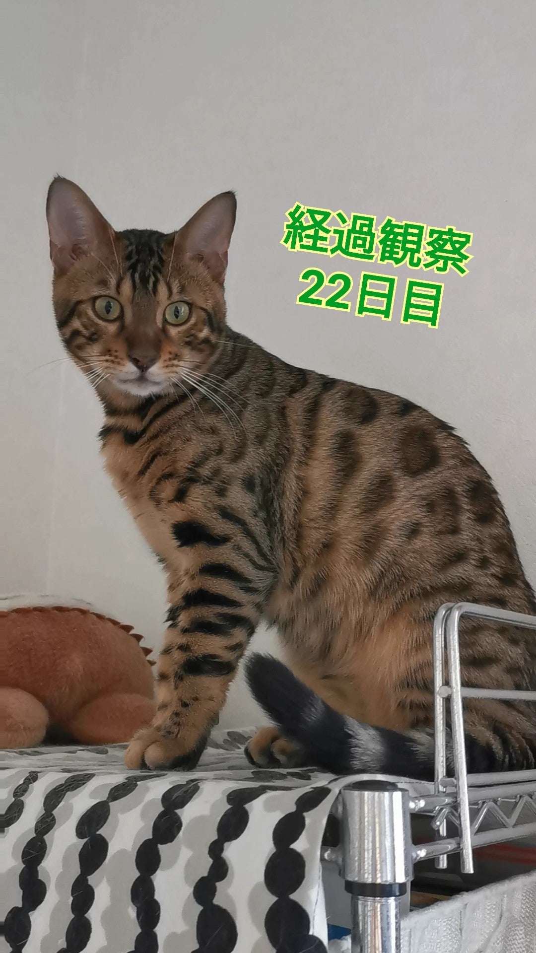 11/14 経過観察22日目最近のお気に入りの場所です。TV台の横にある高さ120cmくらいのラックの上です。直接登ることができないので、①TV台②TVの上③ラックと段階を踏んで登ってるのですが幅3cmくらいのTVの上に、よく登れるなと、毎回感心して見ています。すごいずつ、リターンの品が揃ってきました。準備ができ次第、発送致します。