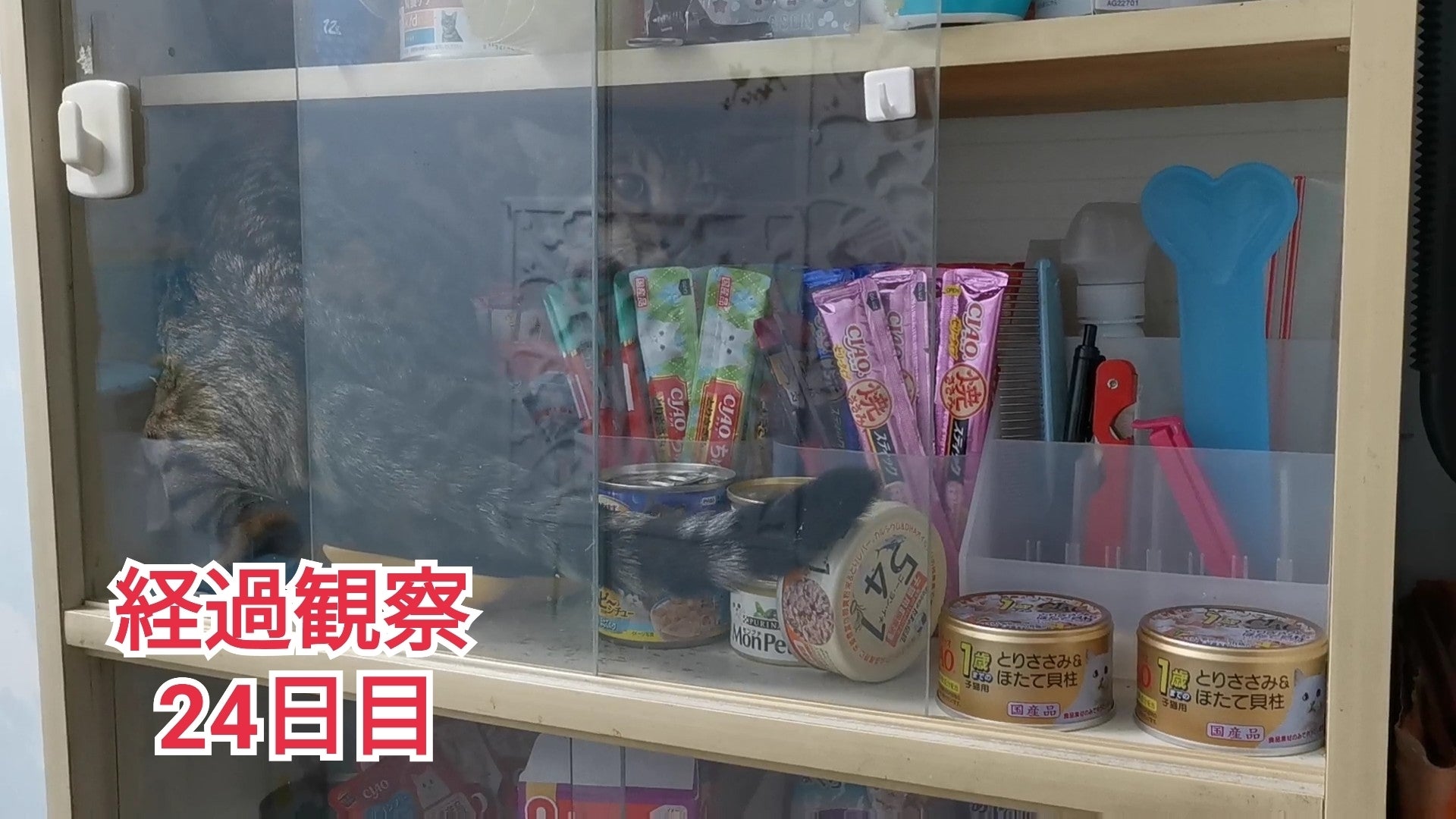 11/16 経過観察24日目本日、猫餌用の棚の扉の開いてる場所が10cmほどのところから侵入している現場を確認。ちゅ~るを物色した後、出ようとしてました。3袋ほど噛まれてましたが、被害はそれだけでした。さすがにガラス扉を開けることはできないので、閉め忘れがないように、気を付けないと!です。