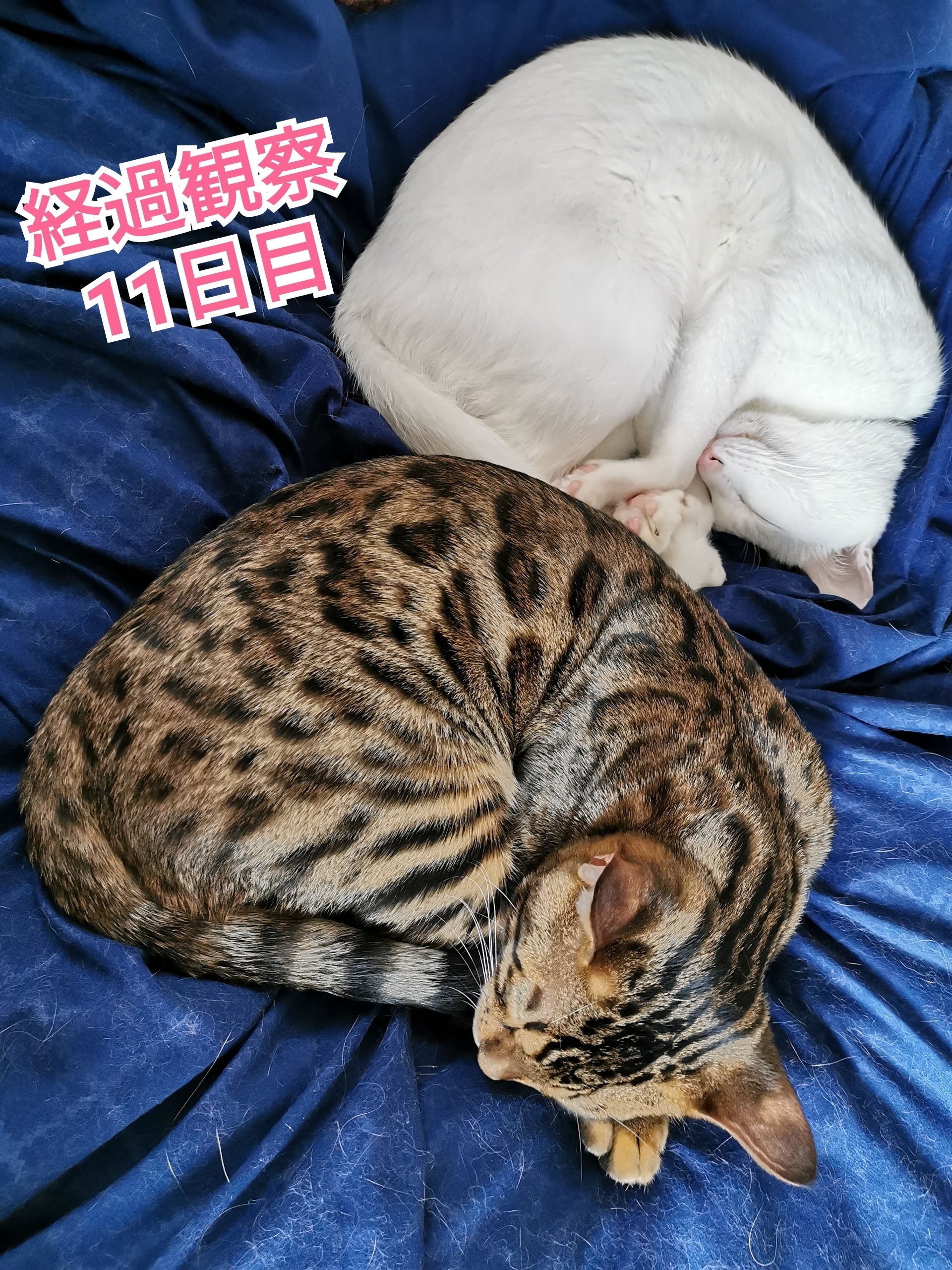 11/3 経過観察11日目体温 38.8℃体重 4.1kg今日は仕事もバイトもお休みだったので、凛太郎といる時間がたくさんできました。とは言っても、1人で走って鳴いて遊んで寝てとやっているので、何をしたというわけてはないのですが。久しぶりに士郎ちゃんが私の部屋にきて(妹の部屋にいることが多い)、凛太郎と一緒に寝てました。2匹鳴らんでニャンモナイト。体重は凛太郎の方が重くなりました。士郎ちゃんが少食な際もあるのですが。それでも、寝たり遊んだり、仲良くしているのを見るのは嬉しいです。