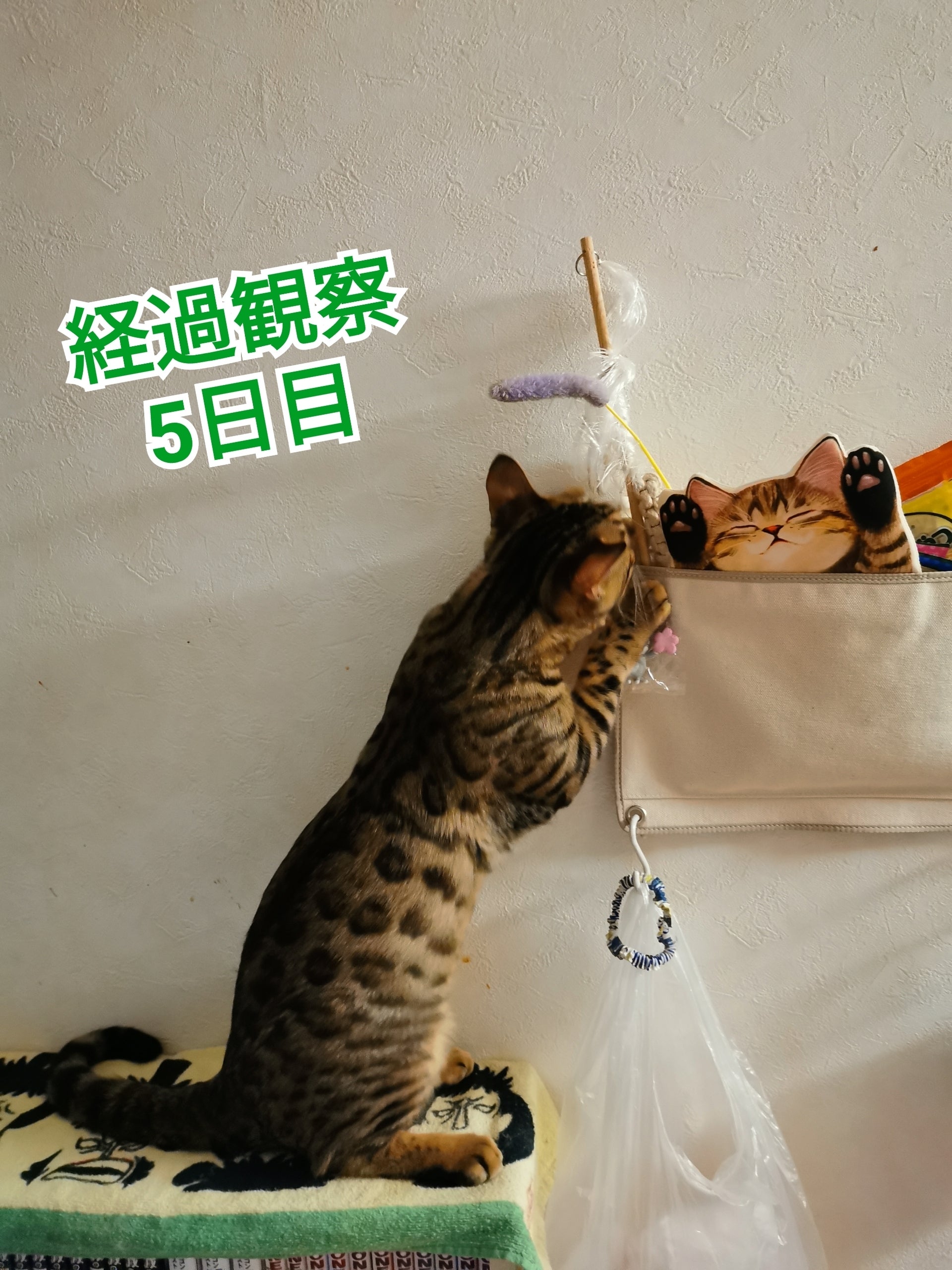 10/28 経過観察5日目体重 38.3℃体重 4.0kg棚の上に置いていたものをなくしたら、そこに乗るようになりました。その横にある猫用ポケットに指してあるおもちゃを見つけ、取り出し中の凛太郎このポケットの中には歯磨きおやつも入っていてので、すぐさま撤収しました。このポケット。もともとは、凛太郎の薬と病院での検査結果などを入れたファイルを入れるために使ってました。もう、そのお役はご免になりました。