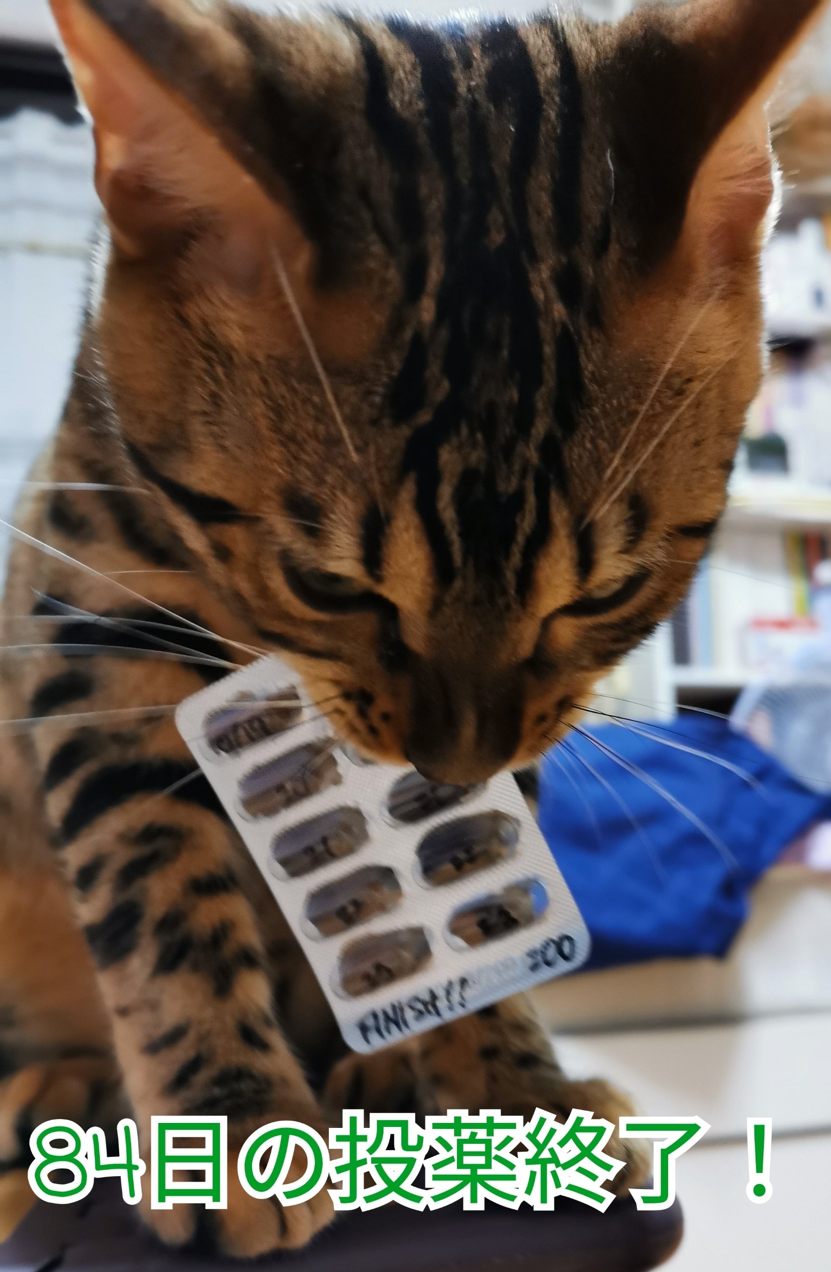 10/23 投薬84日目(最終日)体重 3.9kg体温 38.9℃薬 400mg84日間の投薬、終わりました!!助かってほしい一心で始めた投薬。84日は長いと思っておりましたが、終わってみれば、あっという間でした。1カプセルも無駄にすることなく終われたのは、とてもありがたいです。薬を飲ませることは大変だろうと思いながら始めましたが、カプセルで飲ませるようになってからは拍子抜けするくらい簡単に飲んでくれて、全然手のかからない投薬でした。凛太郎、ありがとう!!そして、凛太郎のことを応援してくださった皆様に、感謝致します。本当にありがとうございました!明日、病院に行き、最終的な判断をしていただきます。その後のお話も聞いてきます。投薬は終わりましたが、クラウドファンディング は10/25(日)まで続いております。引き続きご支援のほど、よろしくお願い致します。