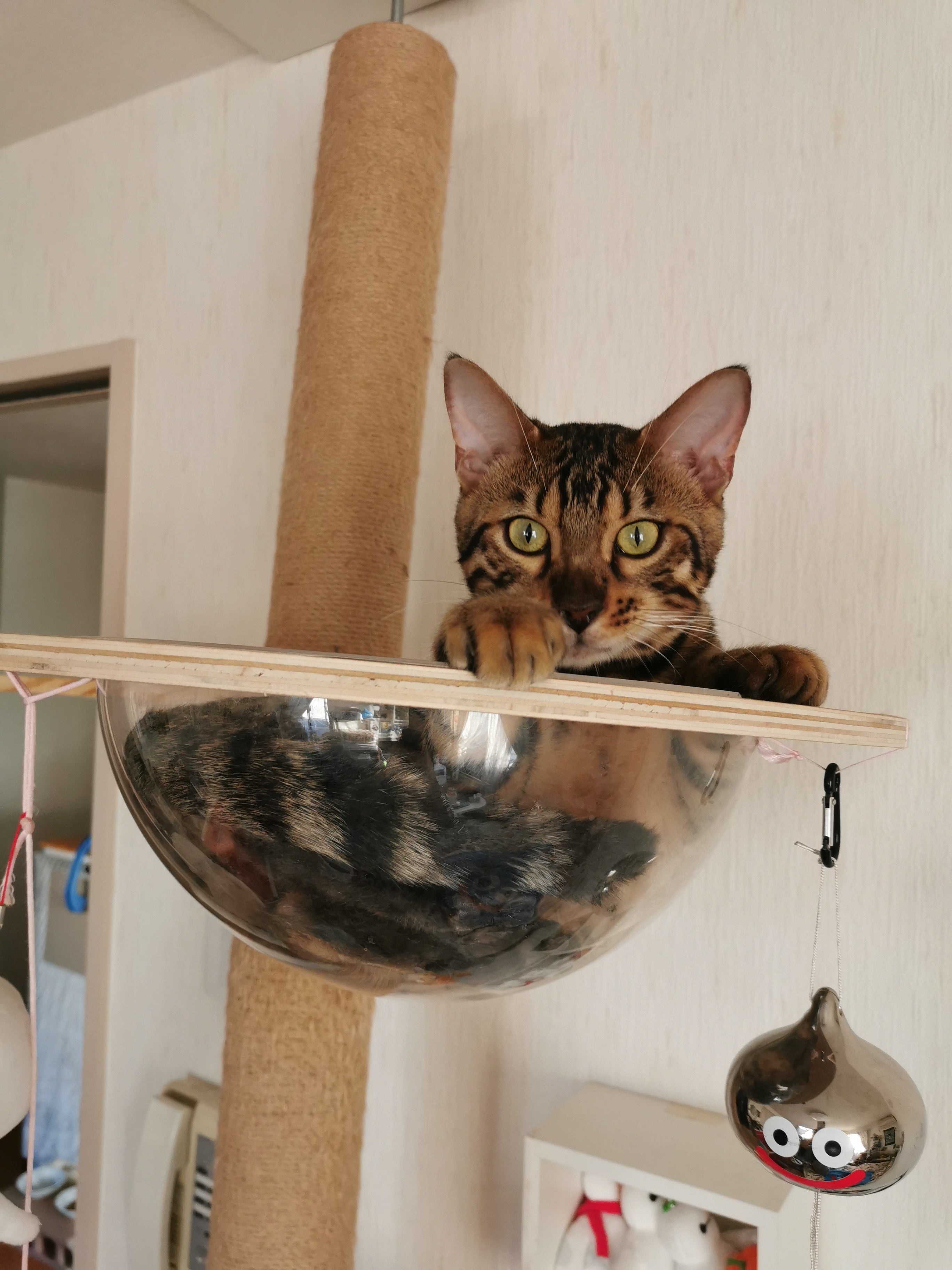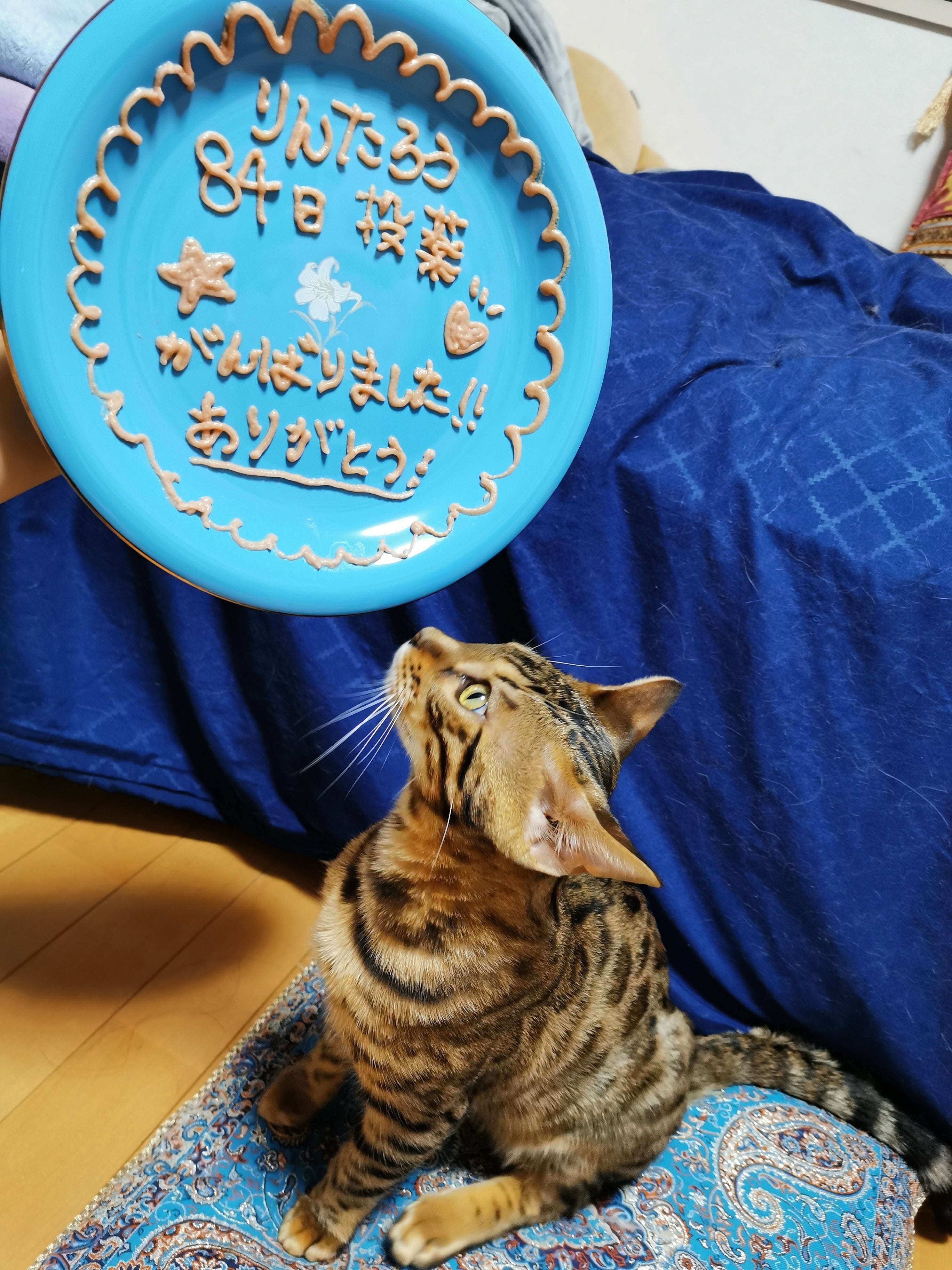 10/25 投薬後2日目体温 38.9℃体重 3.8kg体重、減りました。ただ、3.9の数字も見えたので、微々たるところかな?と思います。今日は初めて、タワーの球体に入りました。そこは士郎兄ちゃんの場所だったので。たのしんでいるようでよかったです。22:00過ぎから寝ていたのですが、23:00直前に突然起きてきました。薬とちゅ~るの時間だったからね。凛太郎の腹時計は、なかなかに正確だもんね。 そんなわけで、士郎兄ちゃんとちゅ~るを訳あいました。