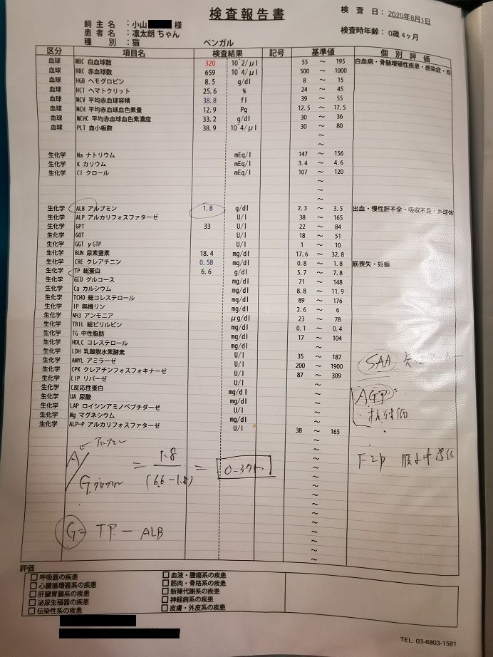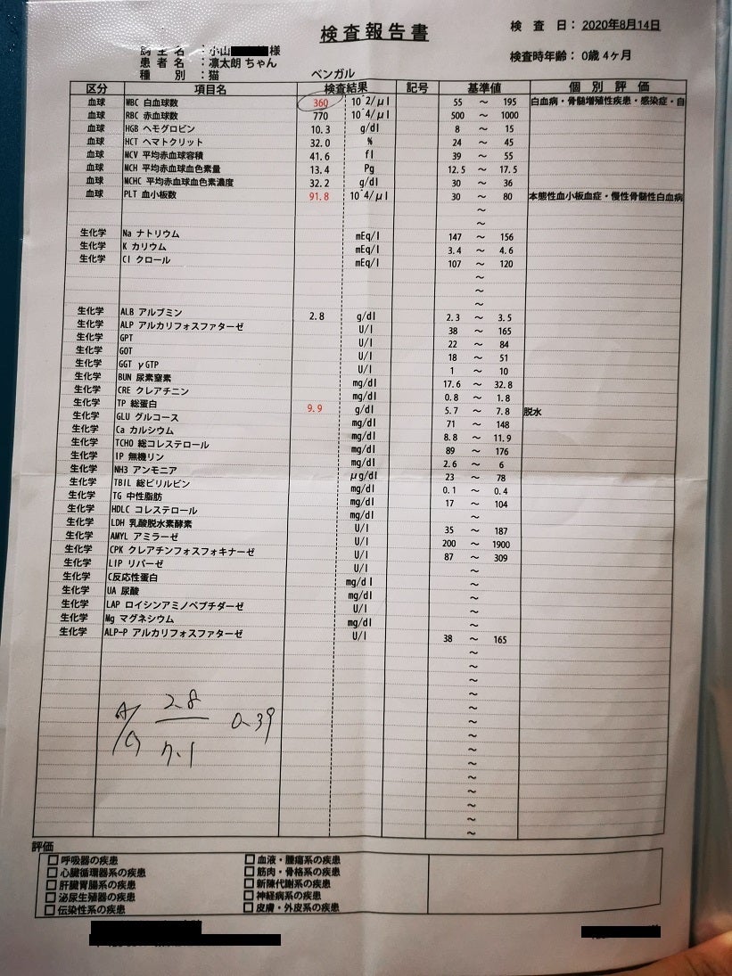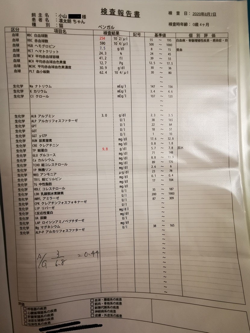 8/7 血液検査結果この1週間で腹水はほぼなくなっているとこのことですので、薬が効いているのだと思います。
