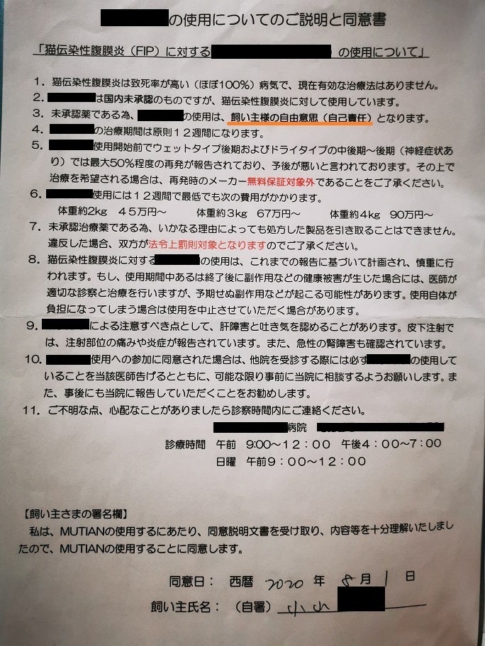 凛太郎の飼い主として、自己責任と判断のもと、凛太郎にとって投与が必要と考えて使用することを決め、薬の協力病院さんとも同意書を交わし、使用しております。