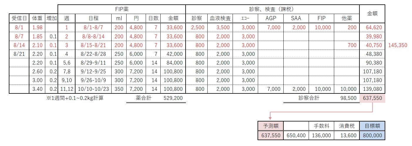 薬と診察代等で約64万円と予測し、目標額を80万円とさせていただきました。