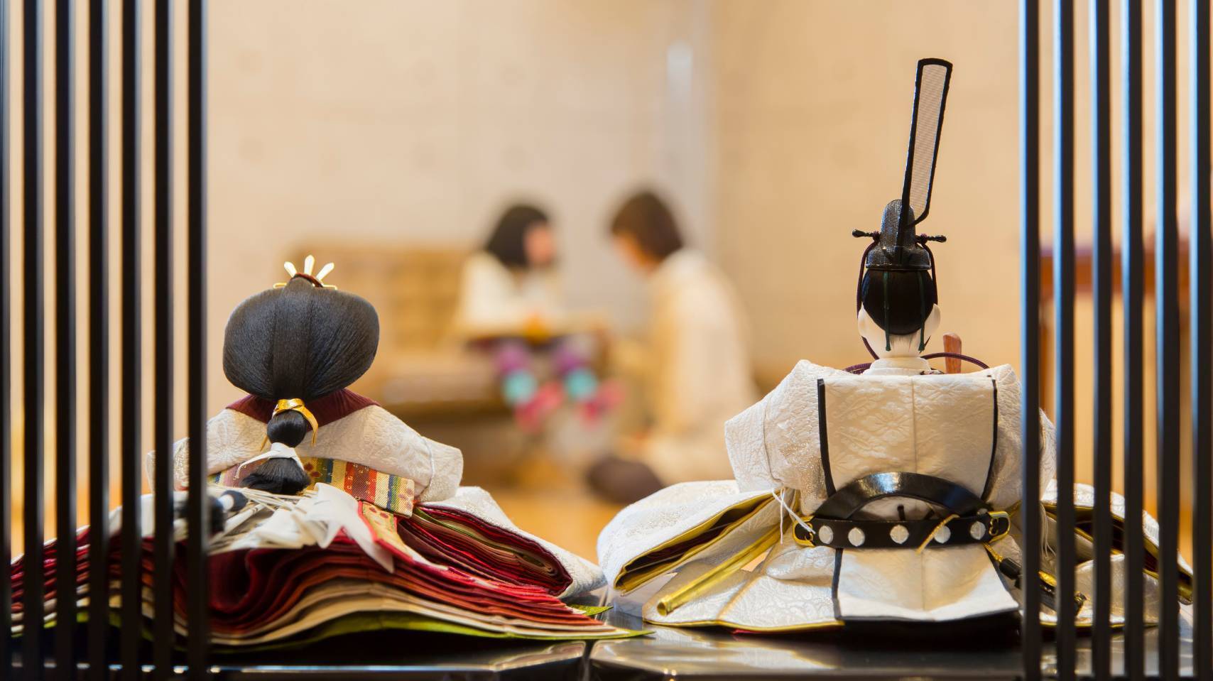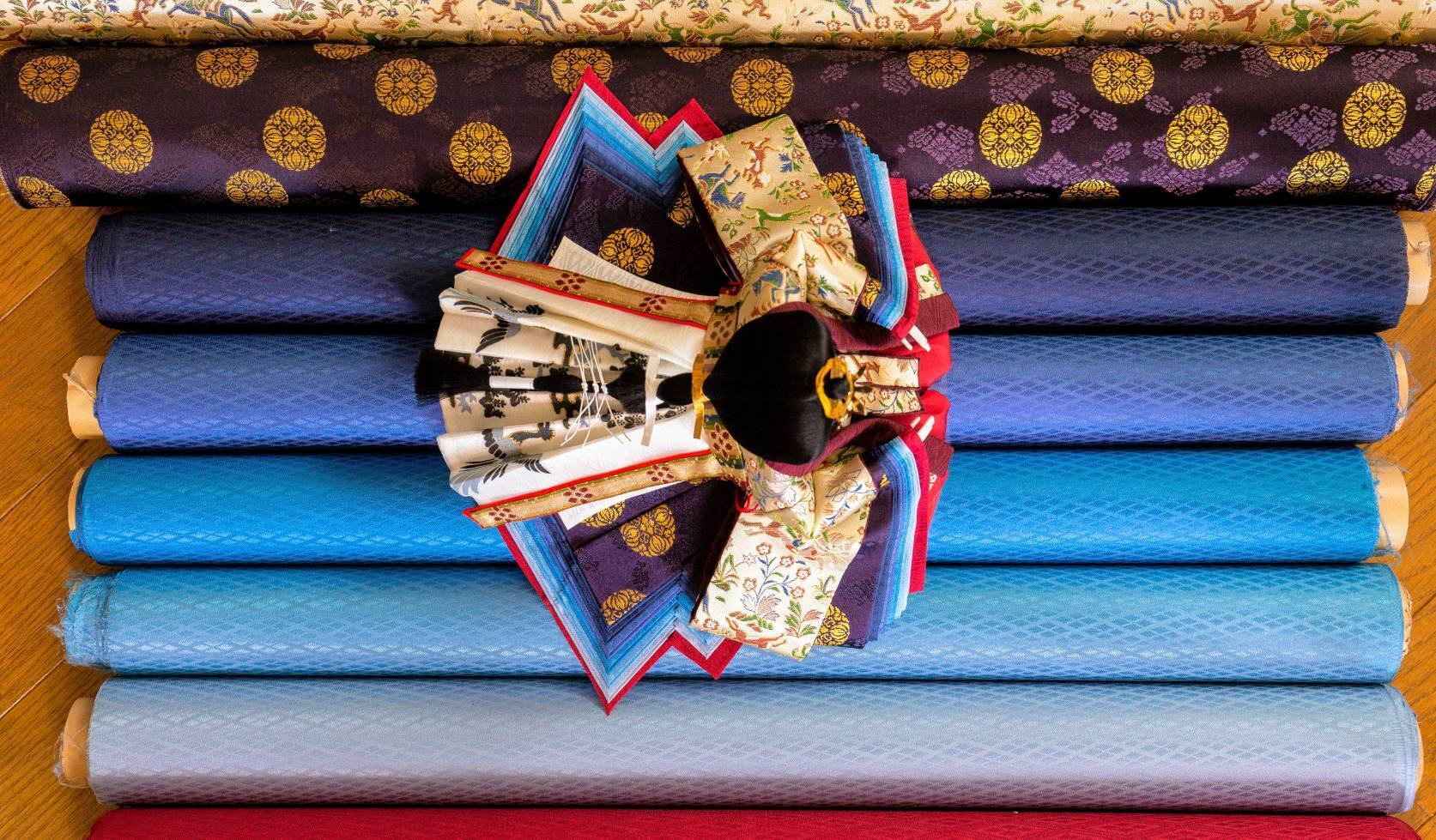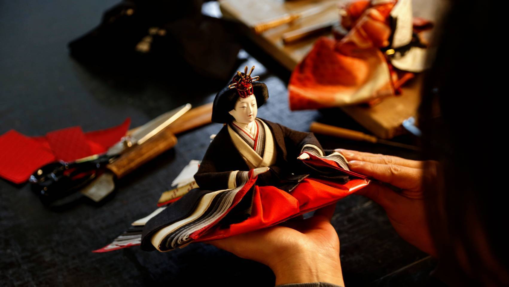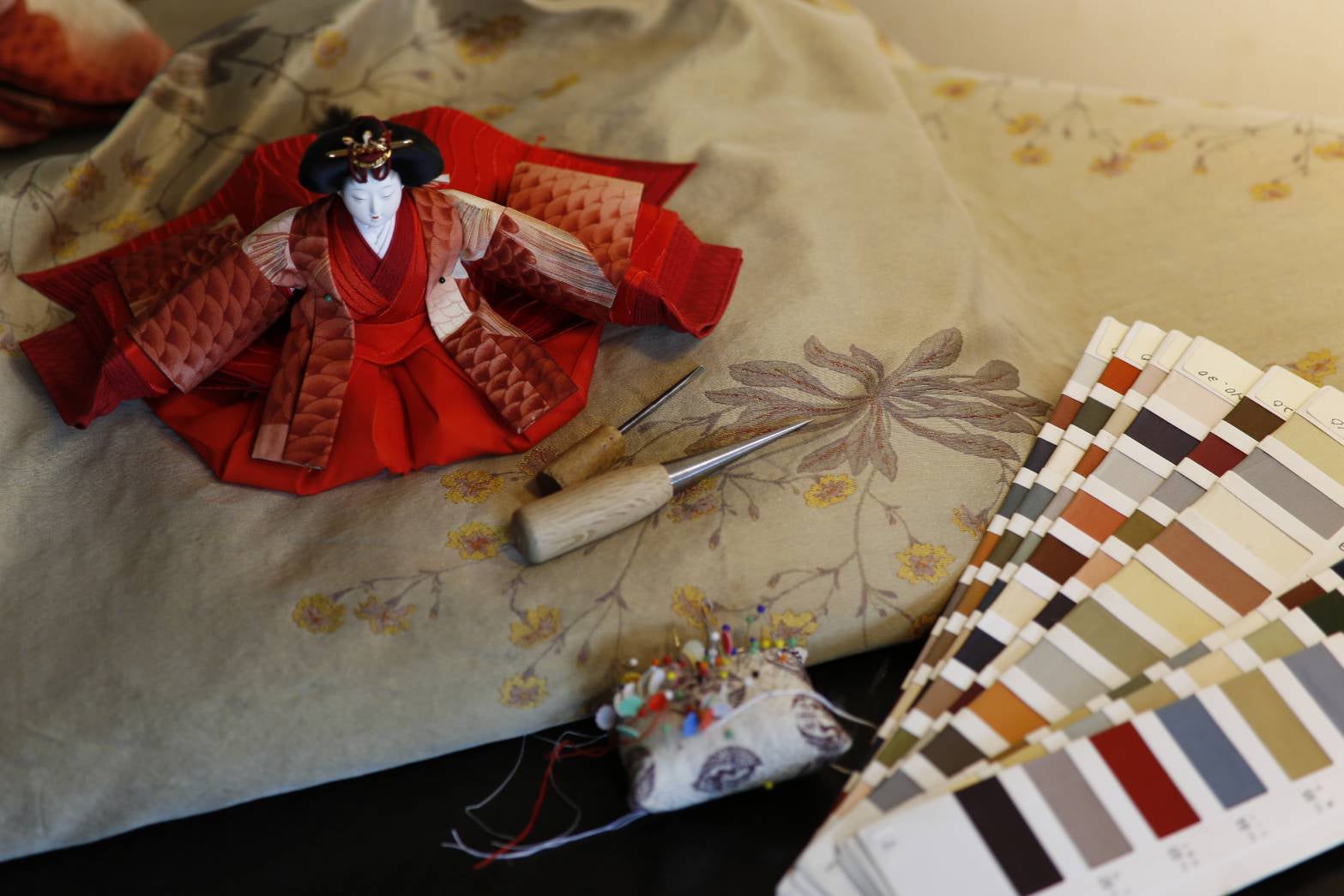 初代から続く伝統工法を守りながら、現代では大変少なくなった、胴組から振付まですべて手業による雛人形を製作しております。装束に用いる正絹は西陣織から本場結城紬まで様々。色の組み合わせは日本古来の「襲ねの色目」に則り、親王飾りひとつひとつに特別な意味や想いをのせて仕上げています。