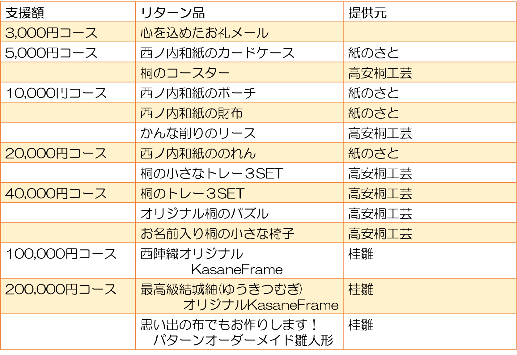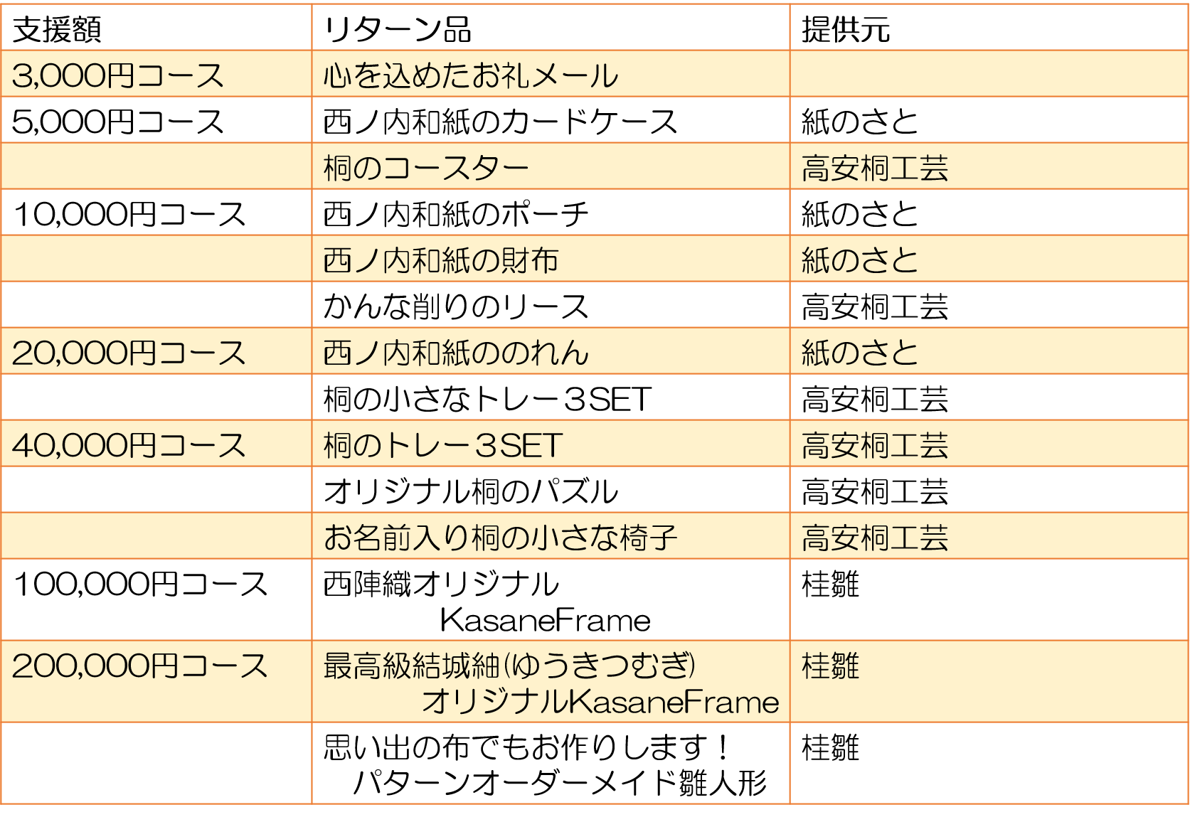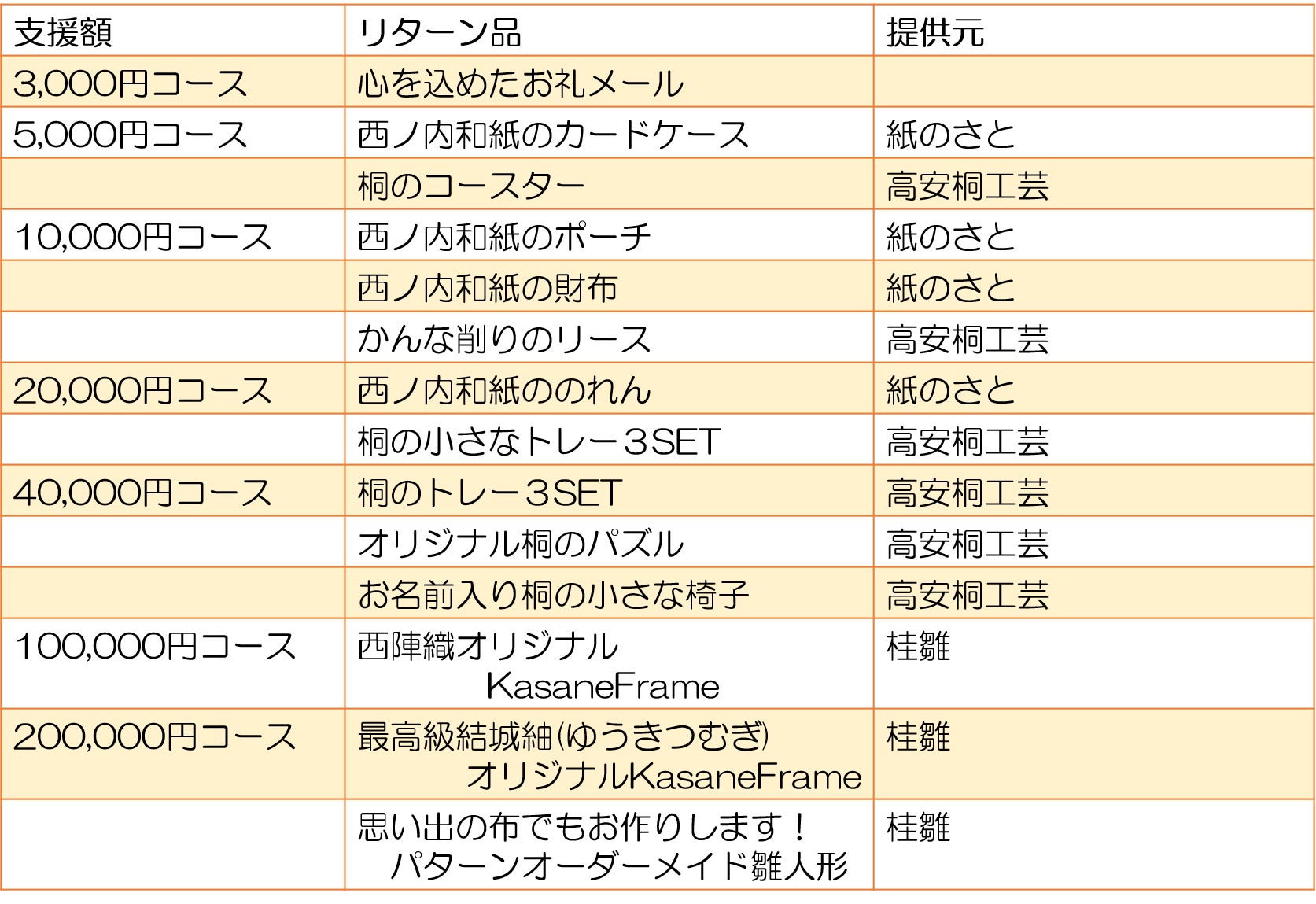皆さまに支援して頂いたお礼として以下のようなものをリターンをご用意させて頂きます。注文を受けてから、職人が一品一品真心をこめて作るものばかりで、世界に一つだけの伝統工芸品です。さらに、これらの品はクラウドファンディング仕様で職人に作ってもらう特別品です。