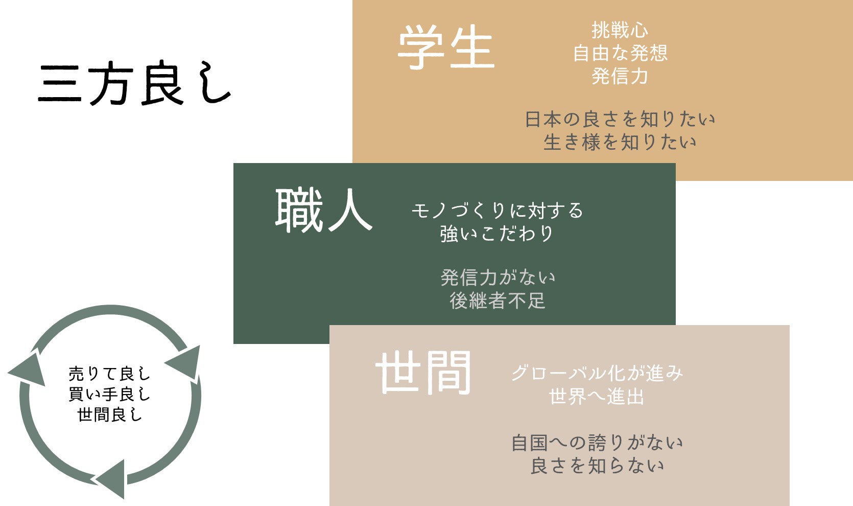 売り手よし。買い手よし。世間よし。 そんな日本の商売の心に基づき、学生、職人、世の中が共生するプロジェクトを目指します!