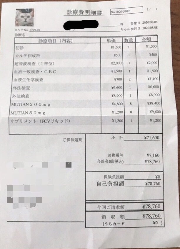 ・2020/8/7 検査の結果が出て、確定ではないがFIP(猫伝染性腹膜炎)の可能性が非常に高いと言われる。最近の研究結果から、FIPに効果のあるかもしれない抗真菌剤(イトラゴナゾール)の投与を提案されるが、裏付けにあまり納得ができず他の方法がないか探す。twitterで近年開発された国内未承認のお薬を投与して完治した猫ちゃんが複数いる事を教えてもらう。(※薬事法により薬名は明記できません)