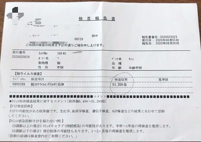 2020/8/7にFIP(猫伝染性腹膜炎)の診断を受けました。