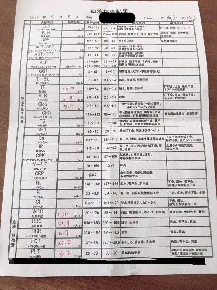 ・2020/7/30 体重が以前より減っている事、真菌感染が完治していない事から急遽血液検査をする事に。検査の結果は悪く、追加でウイルス検査をすることに。