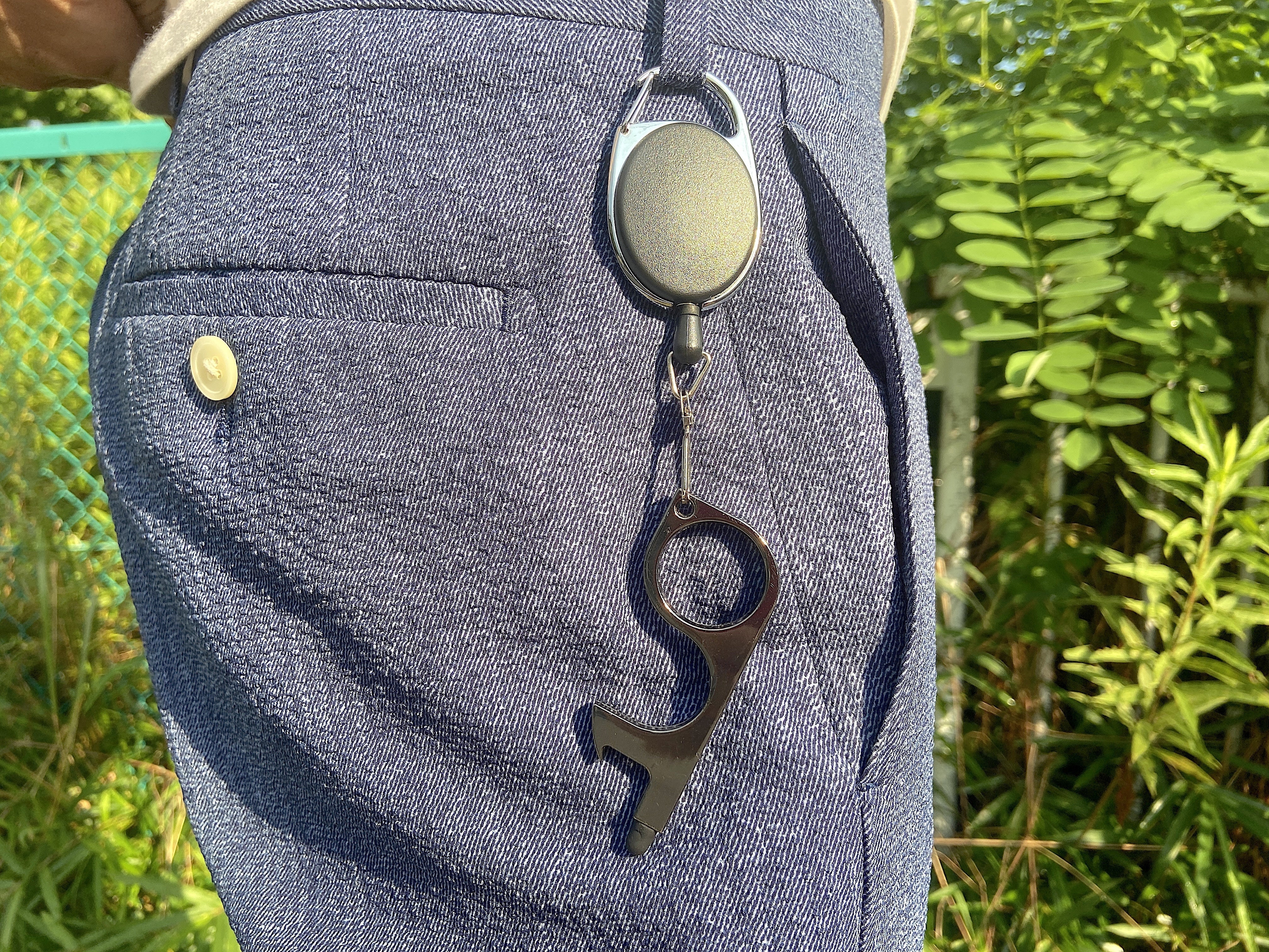 カラビナ付きピンオンリールを付属しておりベルト通し等に吊り下げサッと使うことができます。