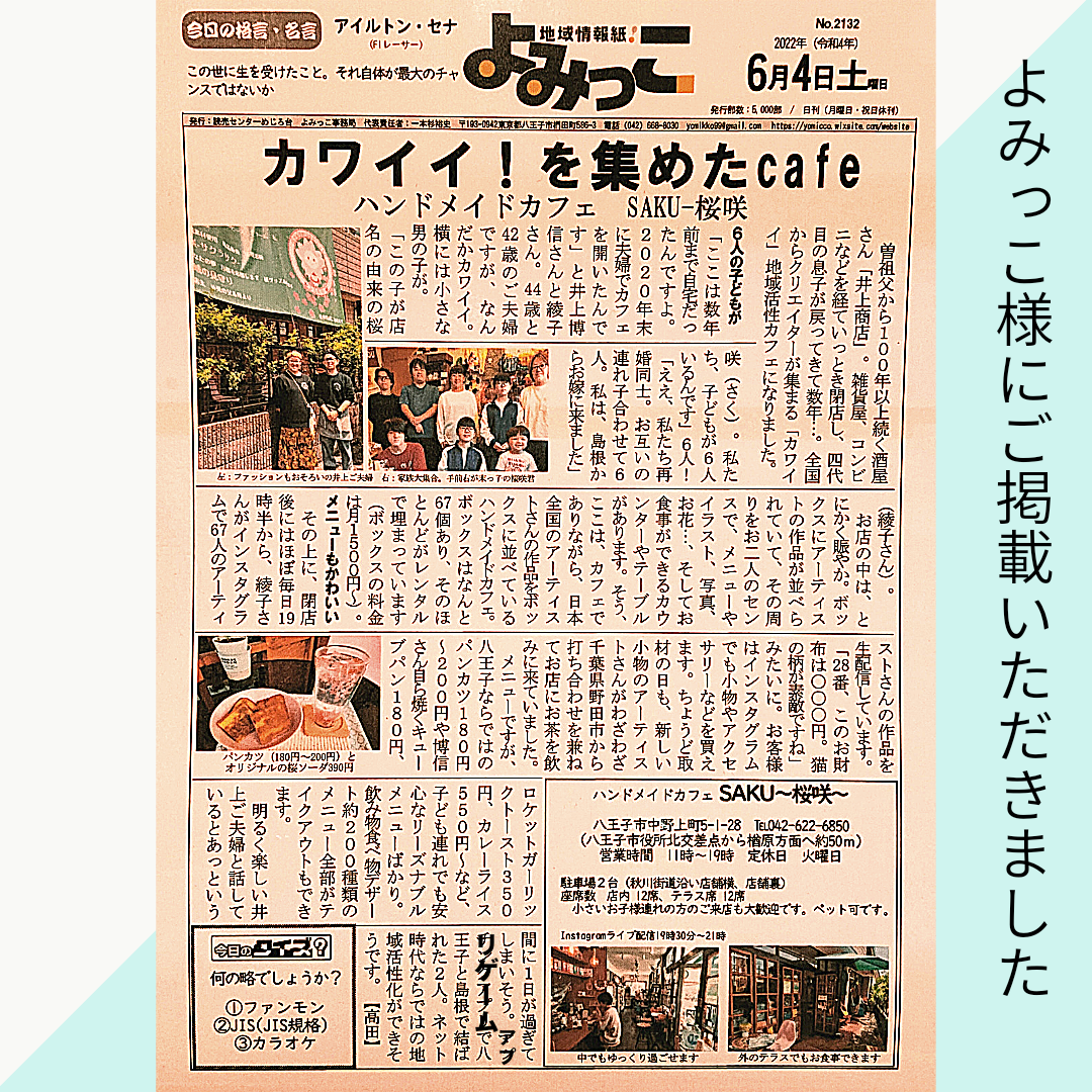 2022/11/23 01:11【活動報告20221122】 こんにちは、代表の井上です^^いつもありがとうございます。大変ご無沙汰しました。おかげさまで12月でカフェSAKUが2周年を迎えます!これも皆様のご支援のおかげです!ありがとうございます。たっっっくさん報告があります^^1.当店3度目のテレビ取材が入り、放映日が決まりました! テレビ東京系列 11/23(水・祝) 12:00~ 「かまいたちのオモロい協会見つけました!」 直前の連絡申し訳ございません。 ぜひご覧ください^^2.各マスメディア様にご紹介いただきました。 よみっこ様・八王子ジャーニー様版】 https://8dabe.com/2022/07/07/yomicco-2132-2/ Mはち様】 https://hachioji-life.com/?p=29610 八王子法人会様】 https://www.hojinkai.or.jp/ctype01/493 パーソナルライターおくやまふみ様】 https://note.com/pw_fuokumi/n/n7c69cfa414ce3.コラボいただきました。 東京八王子ビートレインズ様】https://twitter.com/hachiojitrains/status/1491317501611098115 たき坊】https://www.instagram.com/p/CkjFEA9Pt8K/?utm_source=ig_web_copy_link しまねっこ】https://www.kankou-shimane.com/shimanekko/goods_cat/sundries/#list ちりゅっぴ】https://www.city.chiryu.aichi.jp/shisei/about/chiryuppi/1453374985483.html#a20 西村園様】https://www.instagram.com/p/CjshIInPxx-/?utm_source=ig_web_copy_link 他4.カフェSAKUをご取材いただいた大学生さんの取材作品が 令和3年度八王子学生CMコンテストの審査員賞を受賞しました! https://youtu.be/k3d0MtkZwVo5.マルシェ出店しました。 第1回元八マルシェ】Mはち様に当店もご紹介いただきました。 https://hachioji-life.com/?p=30123 第1回川口マルシェ・第26回川口やまゆり館まつり】 https://www.instagram.com/p/Ck2fBiiPgQu/?utm_source=ig_web_copy_link 近日八王子市広報、JCOM八王子様をチェックください。 八王子手仕事アートマーケット】今年4回出店させていただきました。 12/10八王子のあの***様が主催の第1回イベントに出店いたします。 ホームページ、インスタグラムアカウントで近日アップいたします。6.カフェSAKU インスタグラムアカウントのLive配信回数が 1,600回を超えました! ありがとうございます^^ これからも素敵な作品の紹介、ほっこりできるLive配信を 行いますので引き続きよろしくお願いいたします。 また私個人のインスタグラムアカウントで「八王子人マップ」という お世話になっているご活躍されている方を紹介する企画をスタートして 今日現在25回(26名)紹介しました。 https://www.instagram.com/saku_saku_0330/7.当店が東京都認定の「とうきょう特産食材使用店」登録されました。 https://www.ouenten.metro.tokyo.lg.jp/shop/info_587/8.昨年の11月に店内増床いたしました。 「2.」Mはち様ご記事に増床後の店内ご紹介があります。たくさんの報告にお付き合いいただきましてありがとうございました。ご支援いただきました「リターン」の有効期限2年が来月2022年12月までとなっておりますのでコロナ対策ばっちり実施して、ご来店お待ちしております。どうぞよろしくお願い申し上げます。ハンドメイドカフェSAKU代表 井上博信 もっと見る
