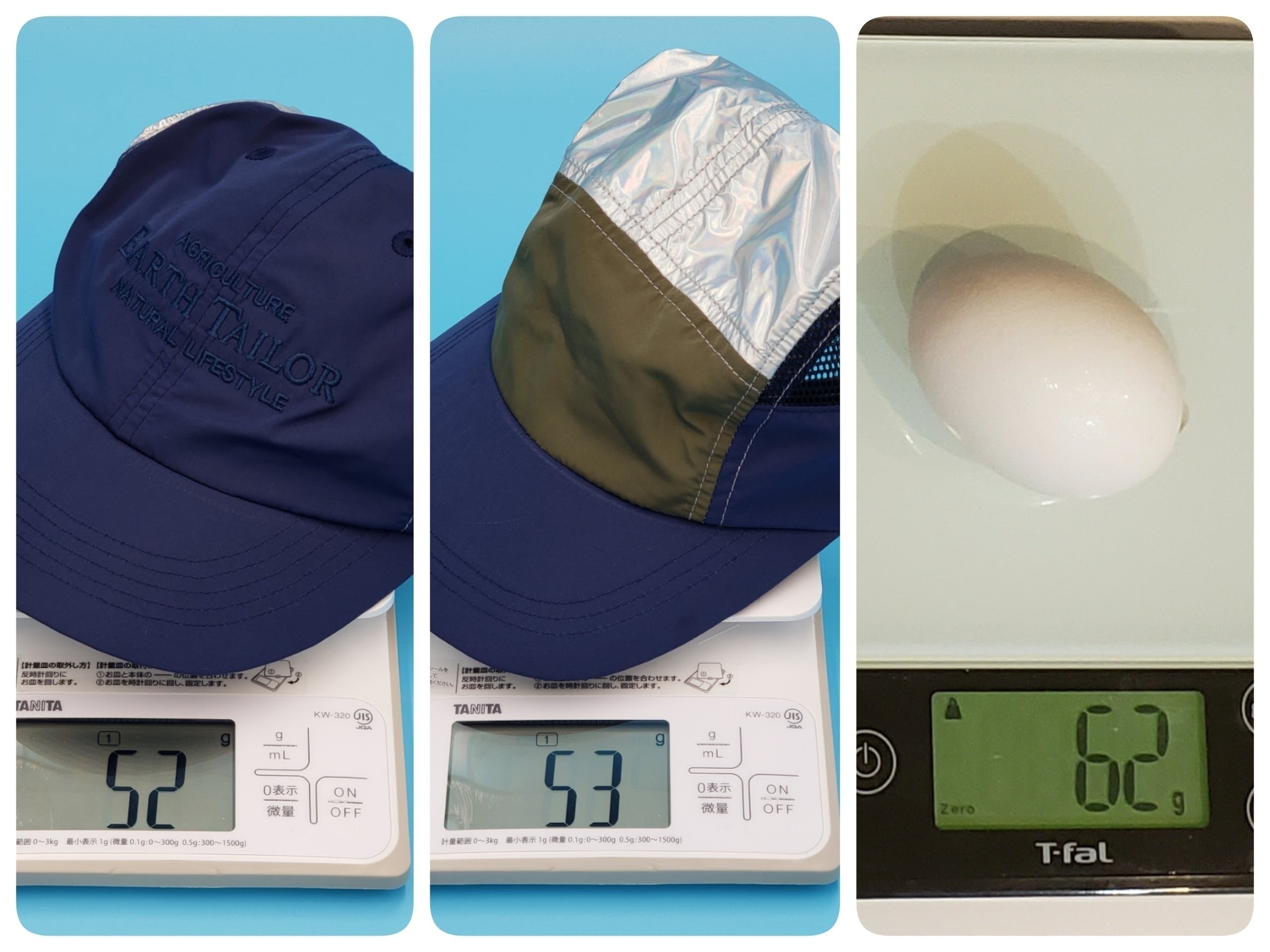 ベースボールキャップ52g、ジェットキャップ53g。卵1個より軽いです!