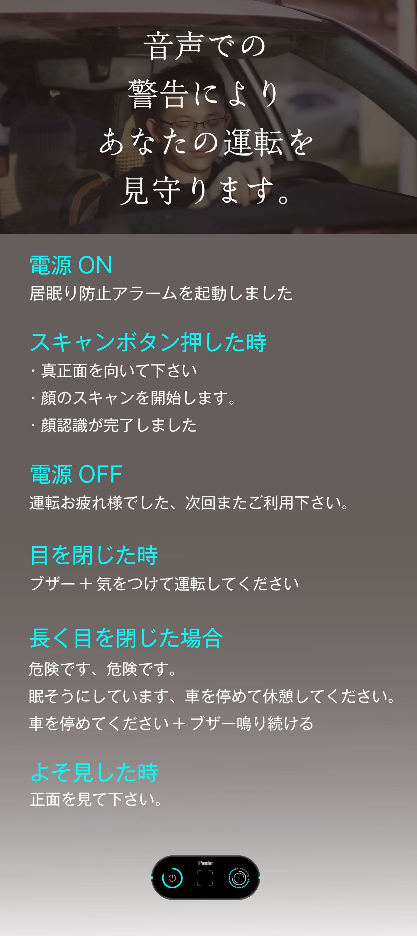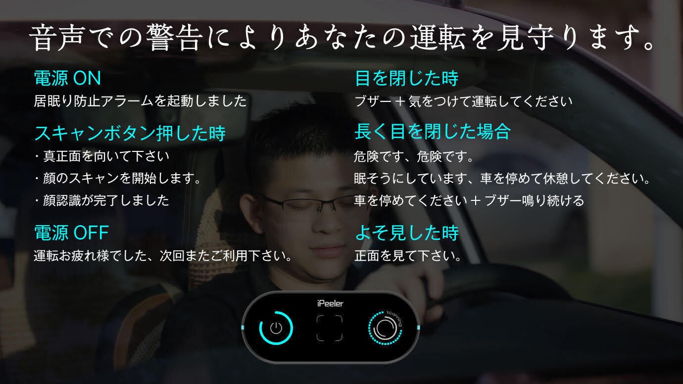 居眠り防止アラーム「iPeeler」はあなたの顔を1-2秒でスキャンして運転を見守り最悪の事態を招かないよう警告し、危険を回避するサポートをします。