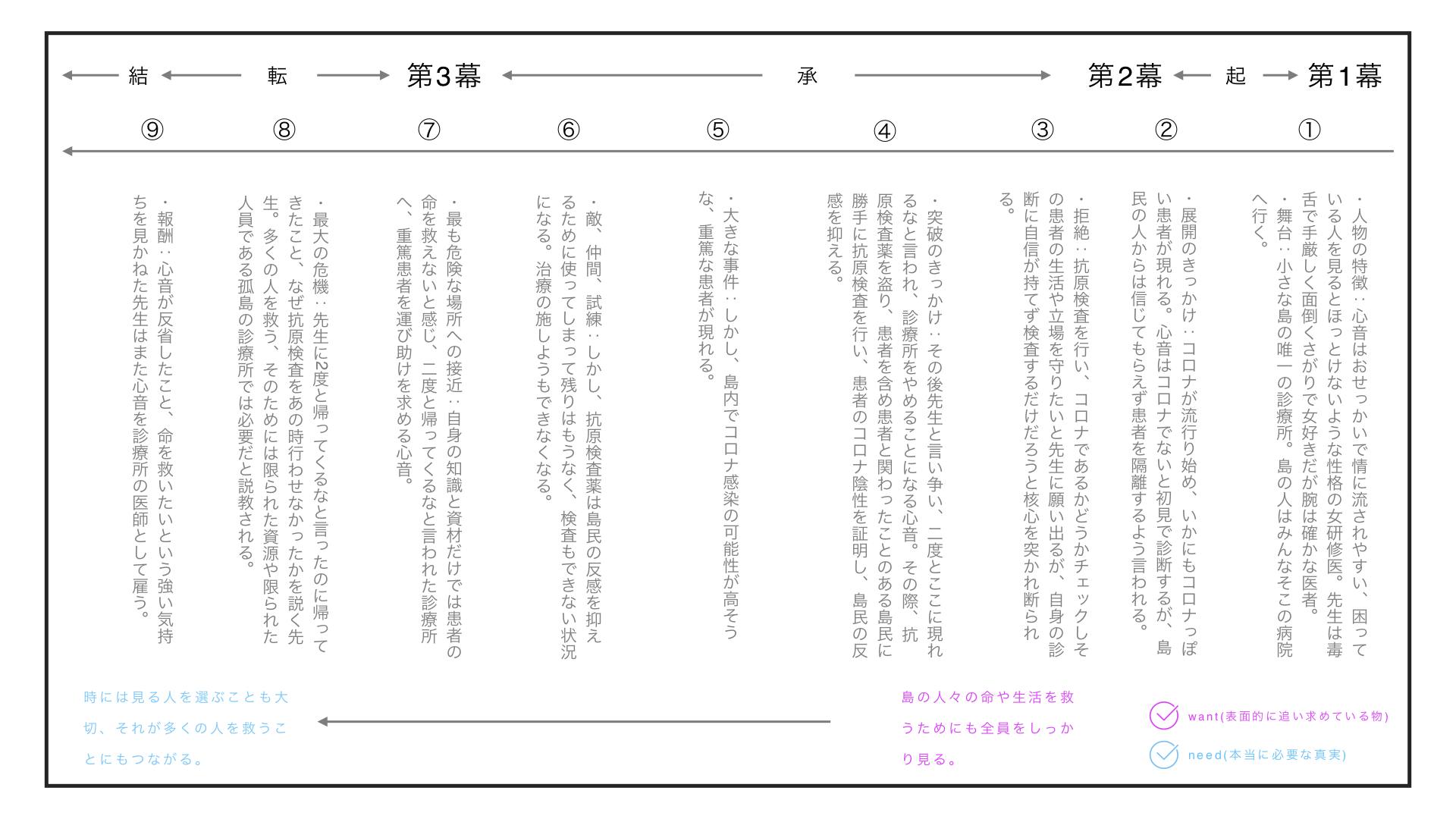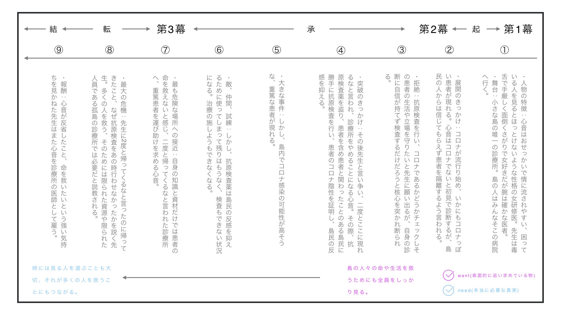 主人公の心音(26)は孤島の診療所で働く新米の医者。しかし、診療所の上司の先生は毒舌で手厳しく女好きの性格の悪い先生だった。ある時、東京ではコロナが流行り始め、島の人達は、咳をしている患者はコロナの疑いがあると決めつけ、島の外へ追い出そうとする。困っている人を見るとほっとけない性格の心音は、コロナではないと分かっていながらも、島の人達を説得するために上司である先生の反対を押し切って抗原検査を大々的に行う。しかし、その後コロナの可能性が非常に高い患者が現れた際に検査ができず困ってしまう心音。そんな時に彼ら医師達のとった二人の行動とは?