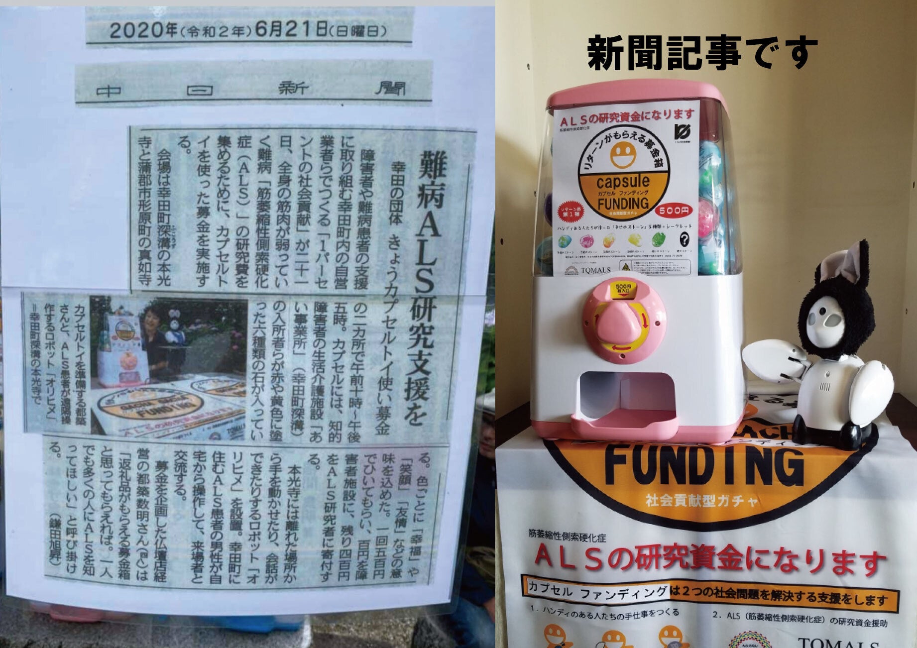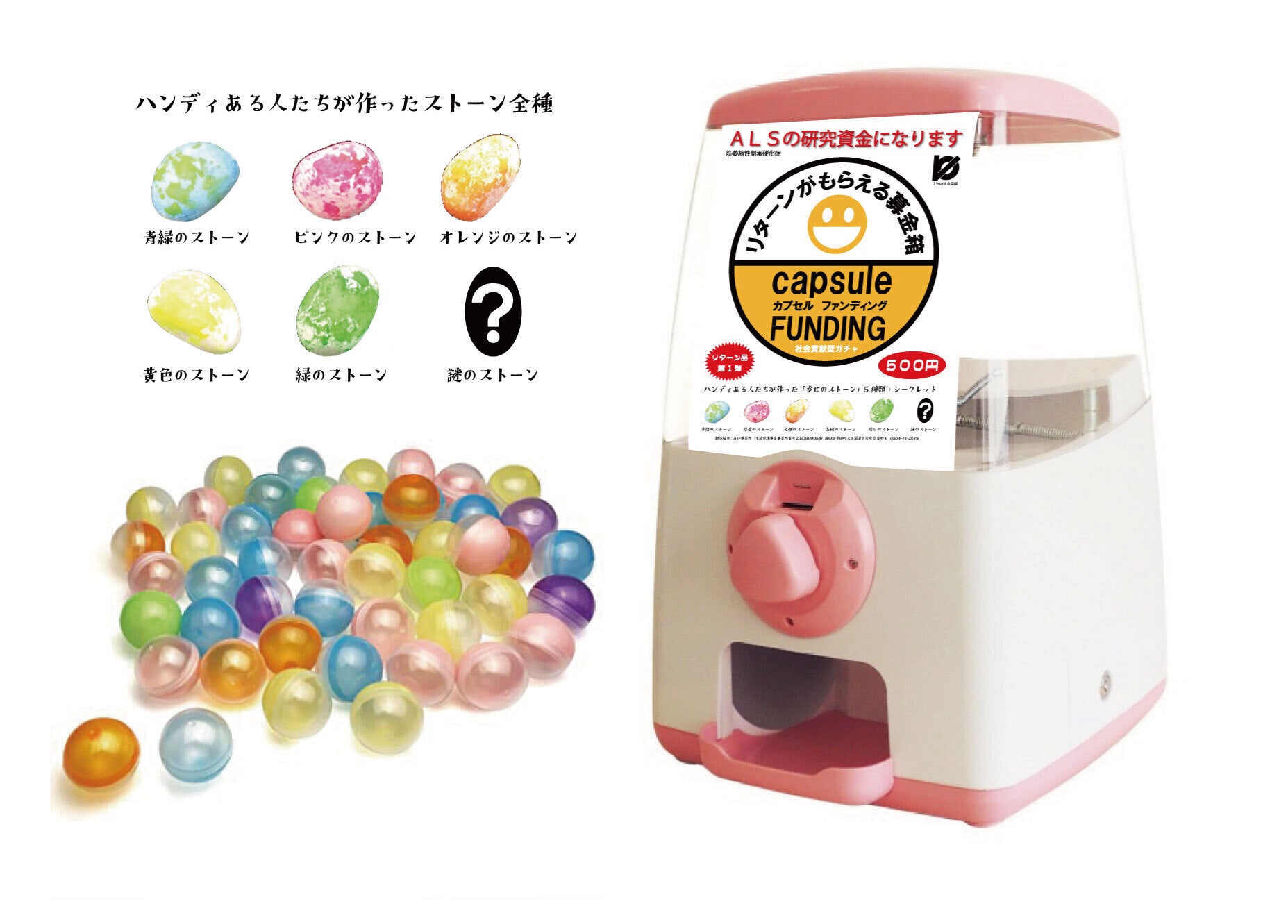 何かと暗い話題になりがちのALSへの支援を楽しく実施したいと思い、ガチャガチャを使った募金システム「カプセル ファンディング」を独自に考案しました。
