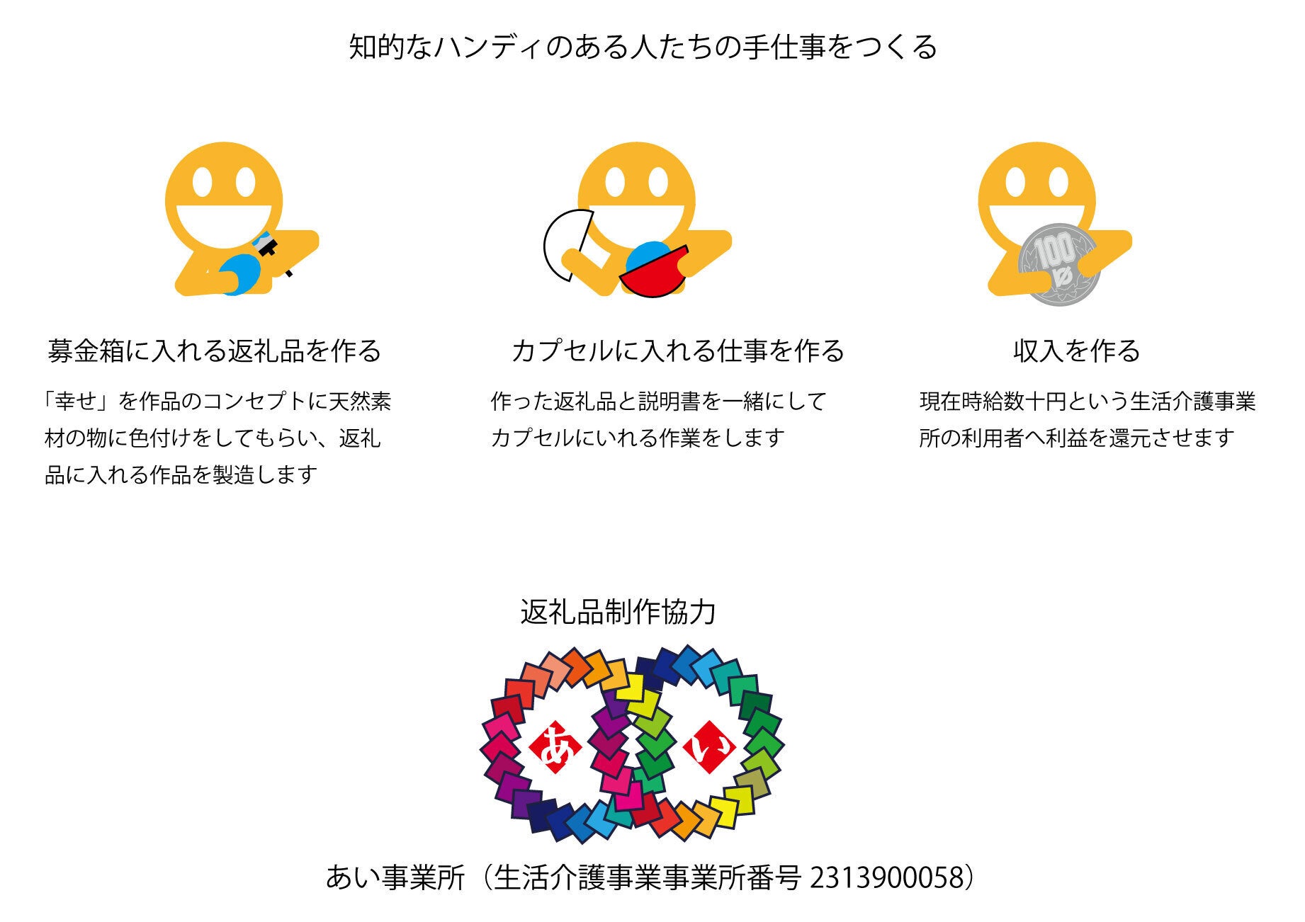 カプセルの中に入れる返礼品を本社団法人の理事が運営する知的障がい者の生活介護支援事業所に依頼し、利用者さんに返礼品を製造してもらっています。