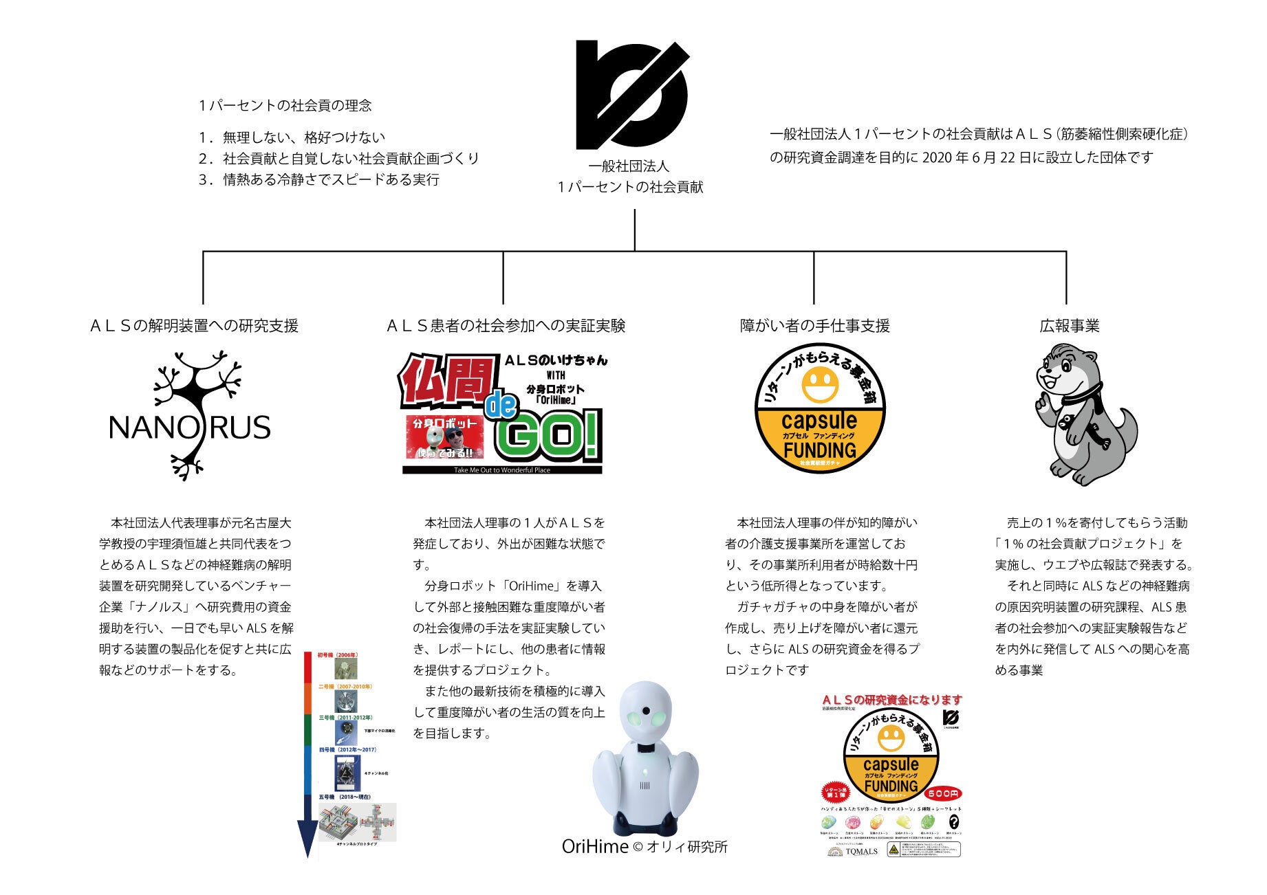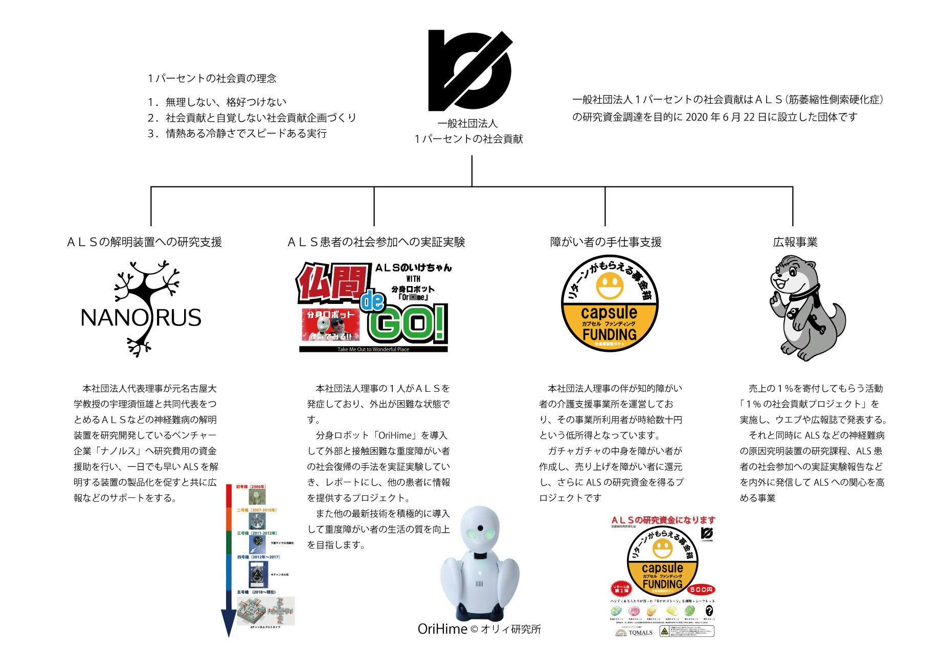 私達、一般社団法人「1パーセントの社会貢献」は難病のALS(筋萎縮性側索硬化症)の解明装置の研究開発のサポート及びALS患者など重度障がい者の社会進出の実証実験を実施するために2020年6月に設立した団体です。